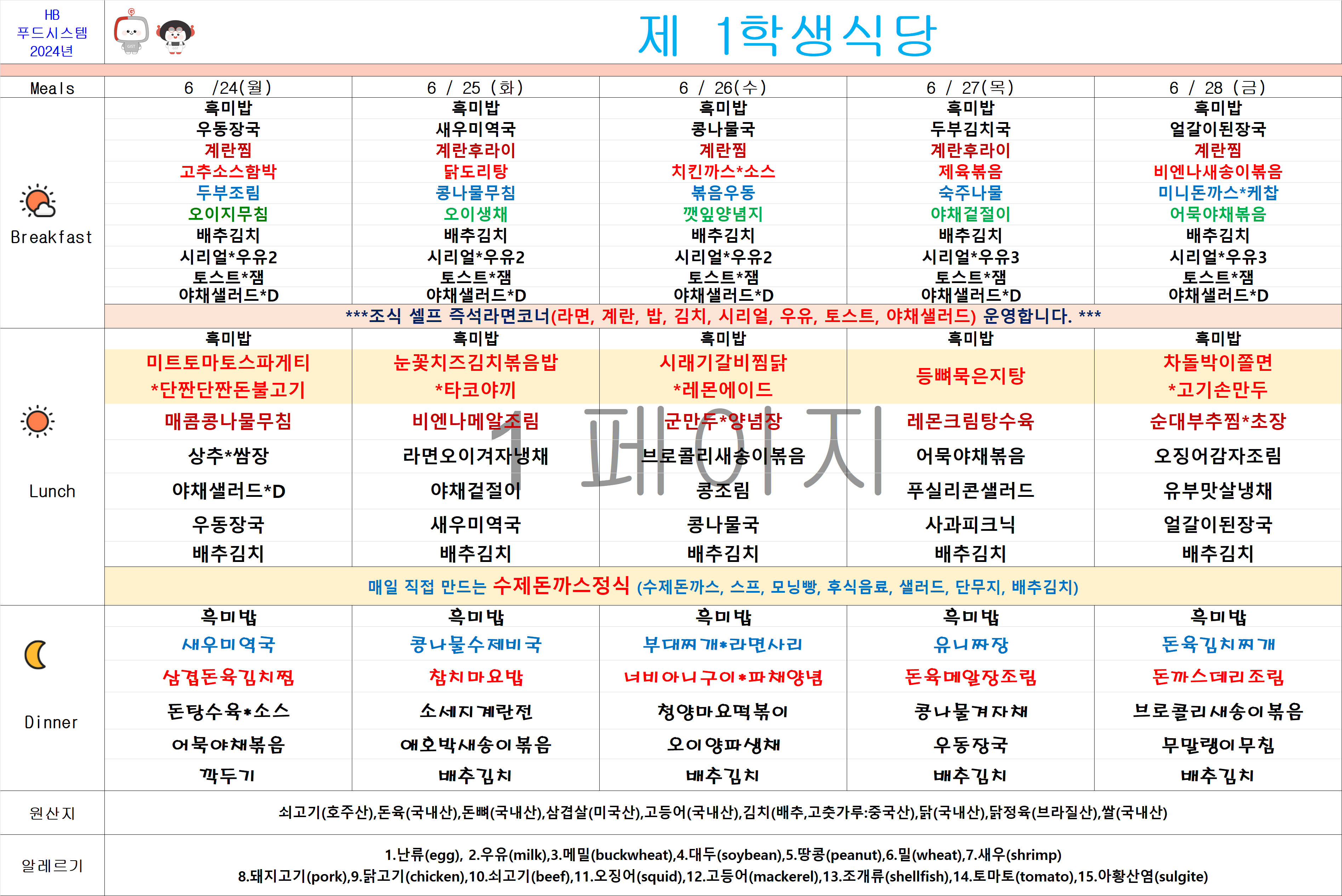 2024년 6월24일~6월28일 식단표
