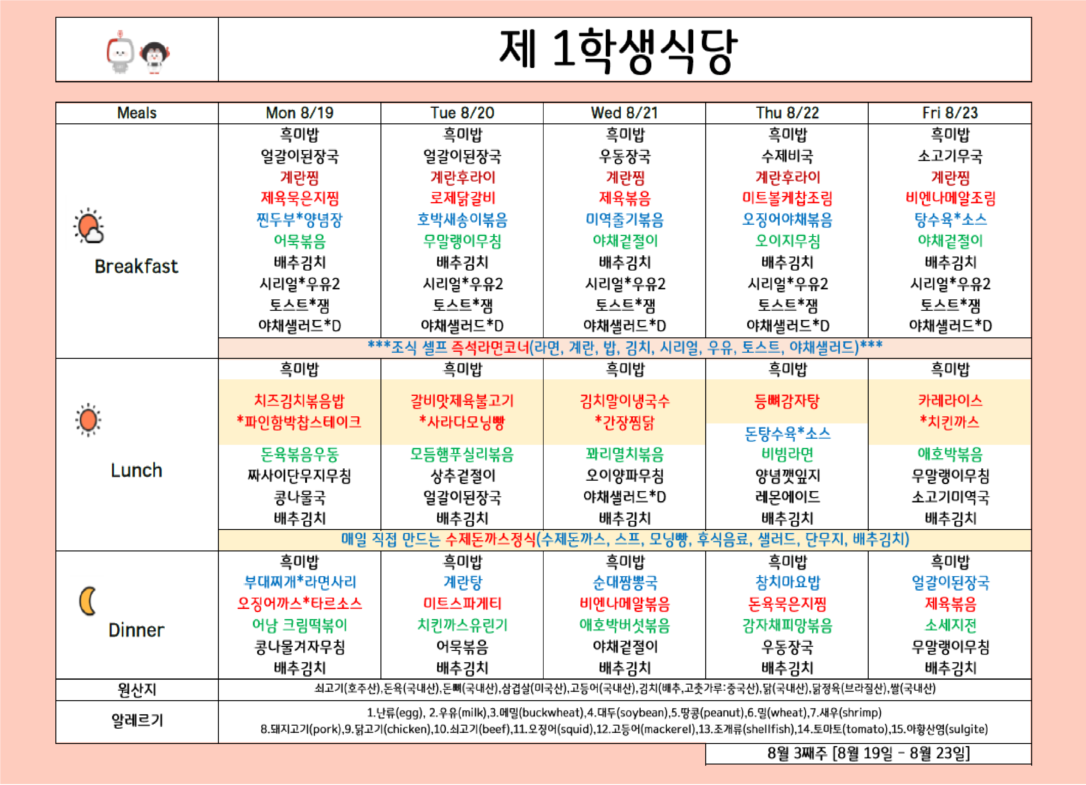 2024년 8월 3주차 식단표 ( 19일 ~ 23일 )