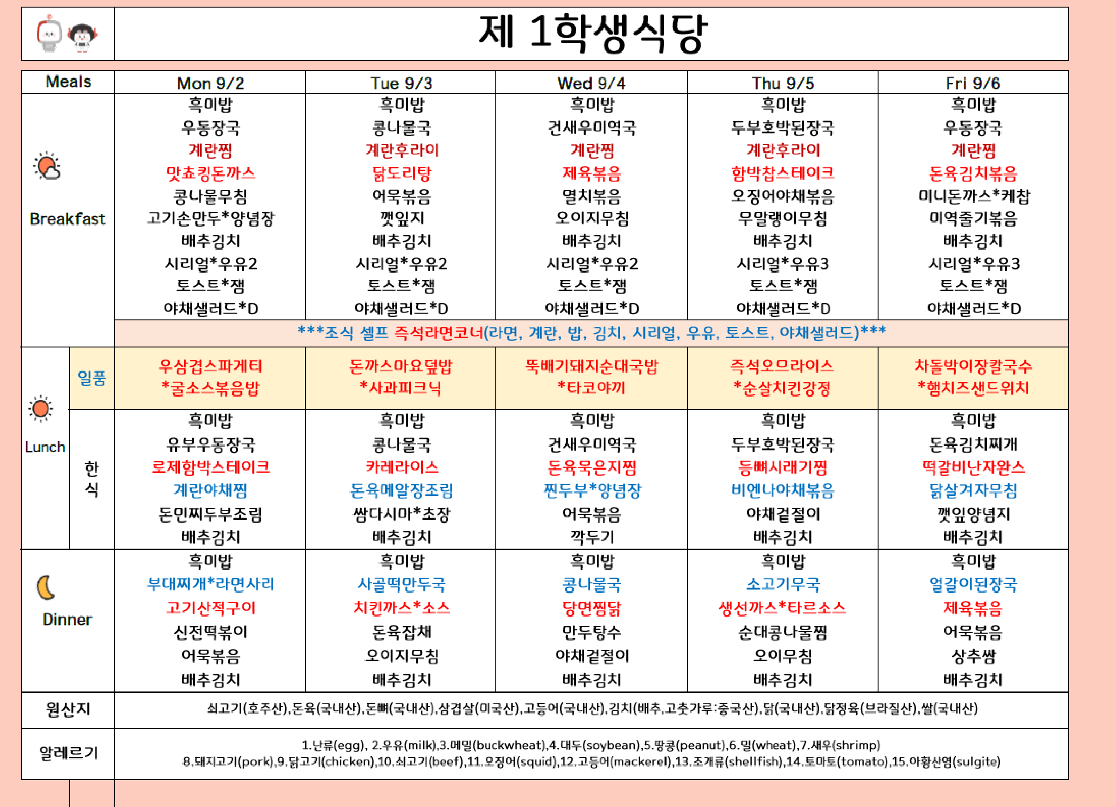 2024년 9월 1주차 식단표 ( 2일 ~ 6일 )