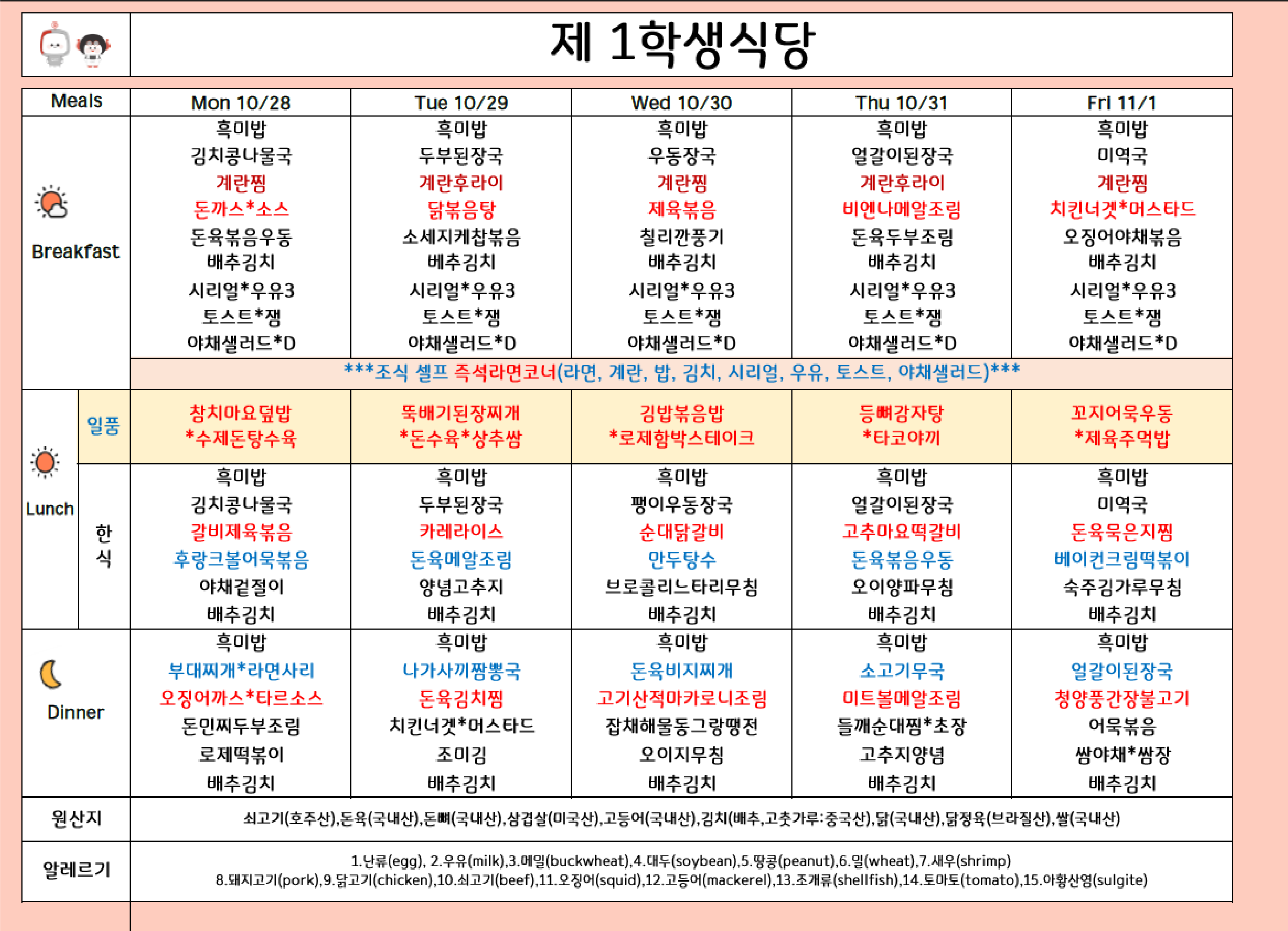 2024년 10월 5주차 식단표 ( 10/28일 ~ 11/1일 )