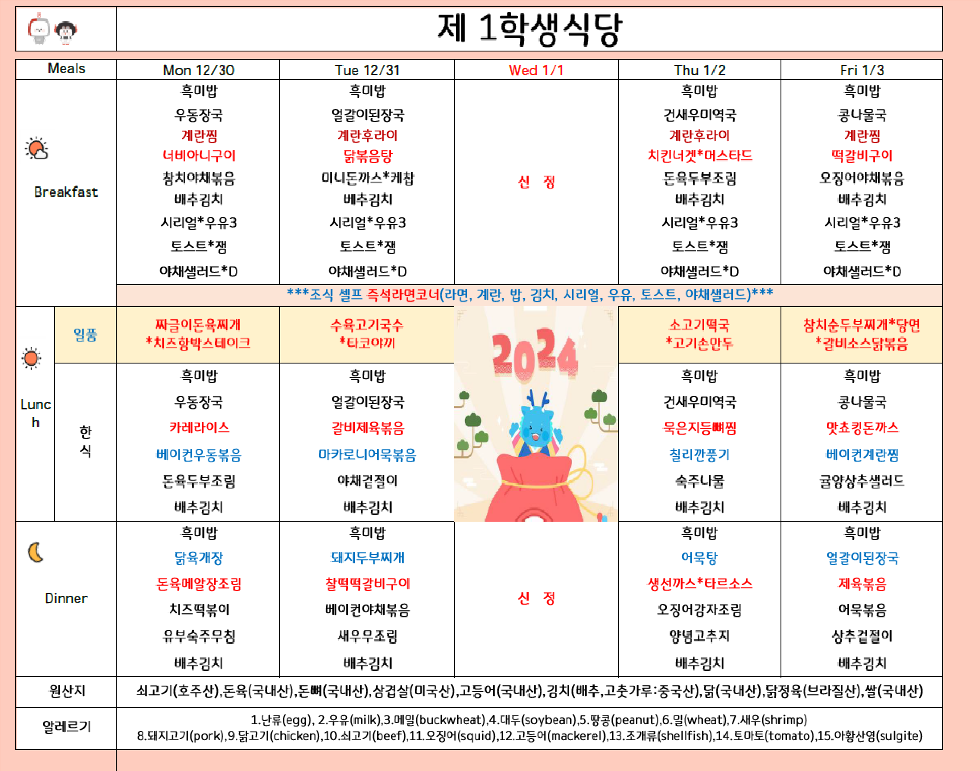 2024년 12월 5주 식단표 ( 12/30 ~1/3)