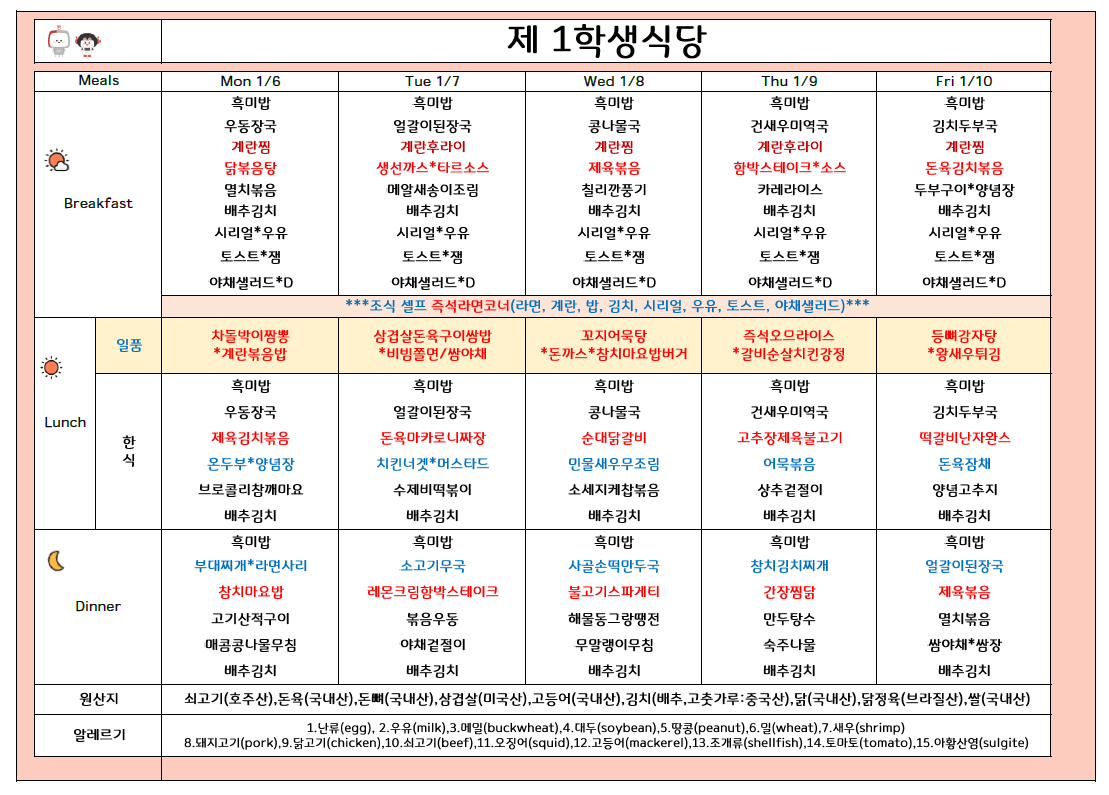 2025년 1월 2주 식단표 (1/6 ~1/10)