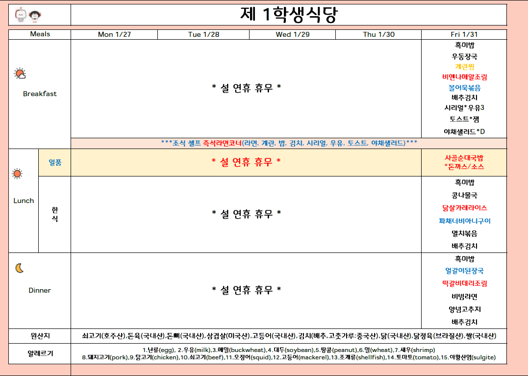 2025년 1월 5주 식단표 (1/27 ~1/31)