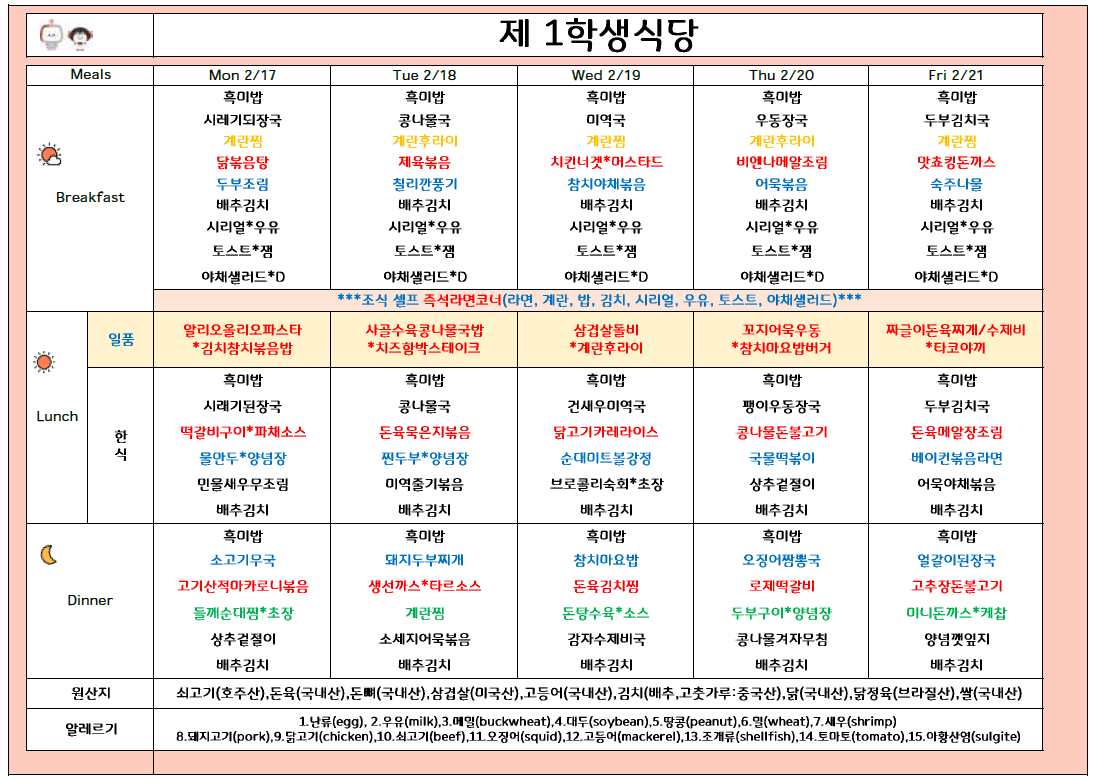 2025년 2월 3주 식단표 (2/17 ~2/21)