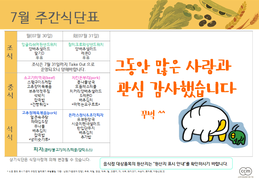 주간식단표 (7/30~7/31)