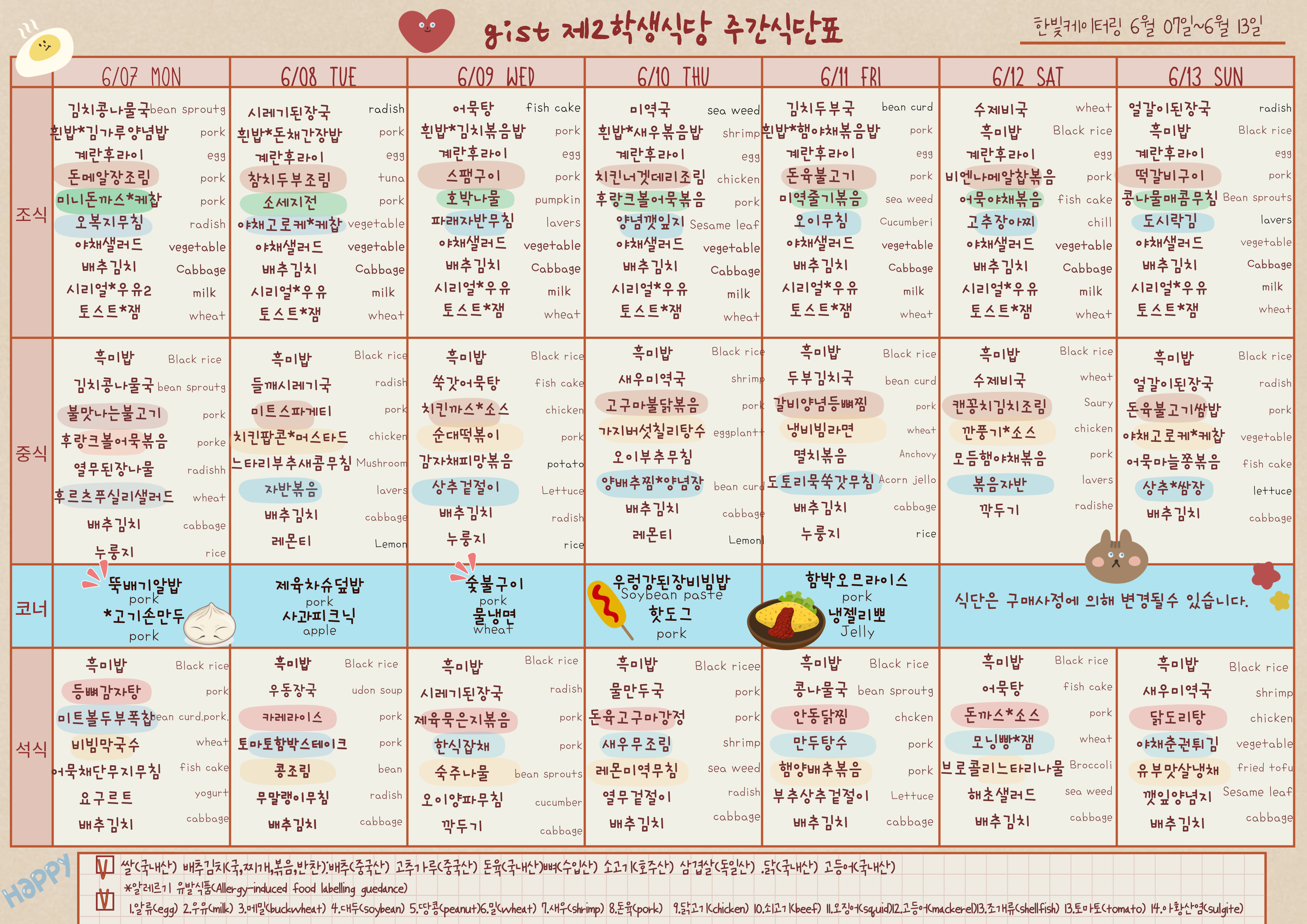 제2학생식당주간식단표(2021.06.7~2021.06.13)