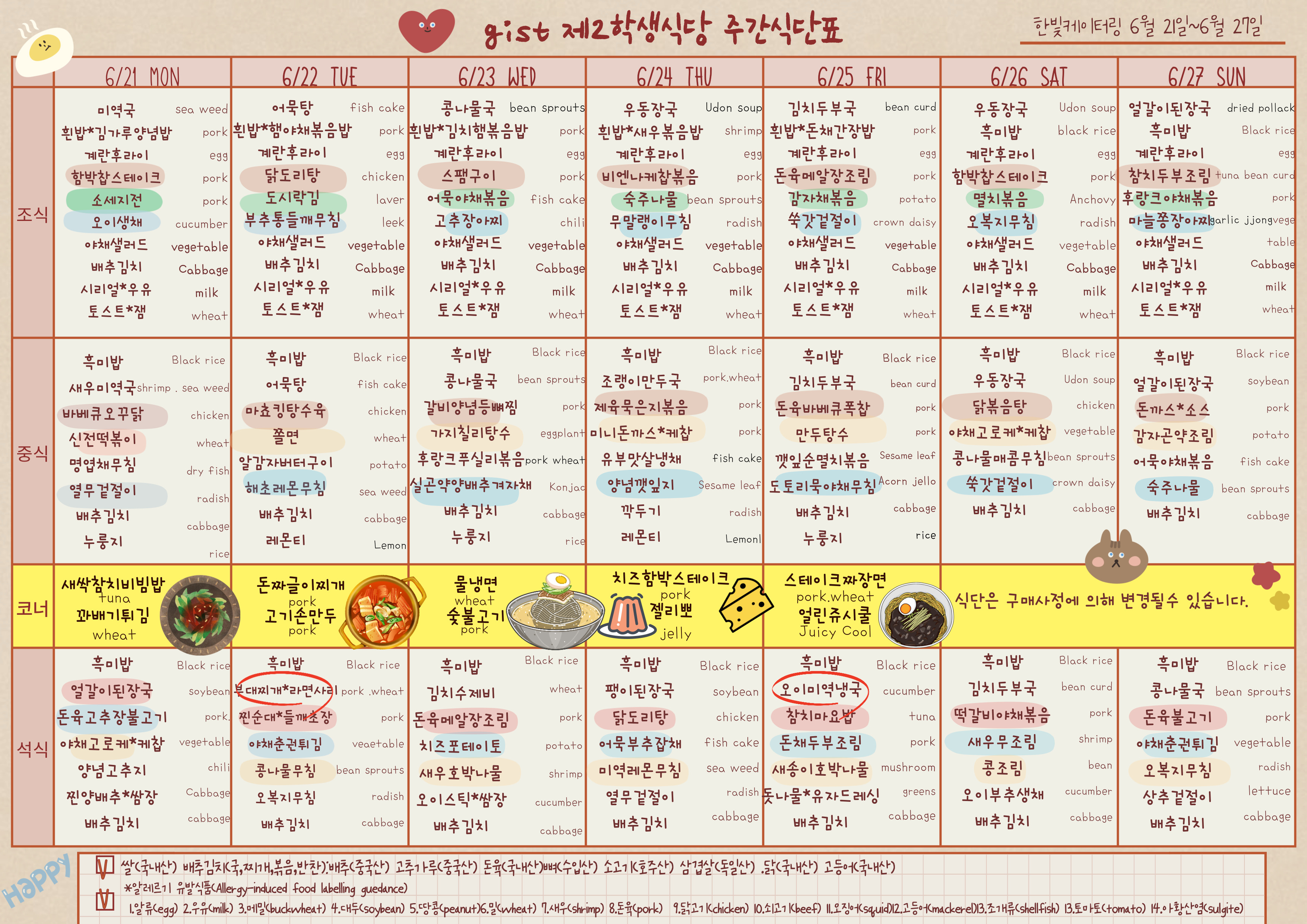 제2학생식당주간식단표(2021.06.21~2021.06.27)