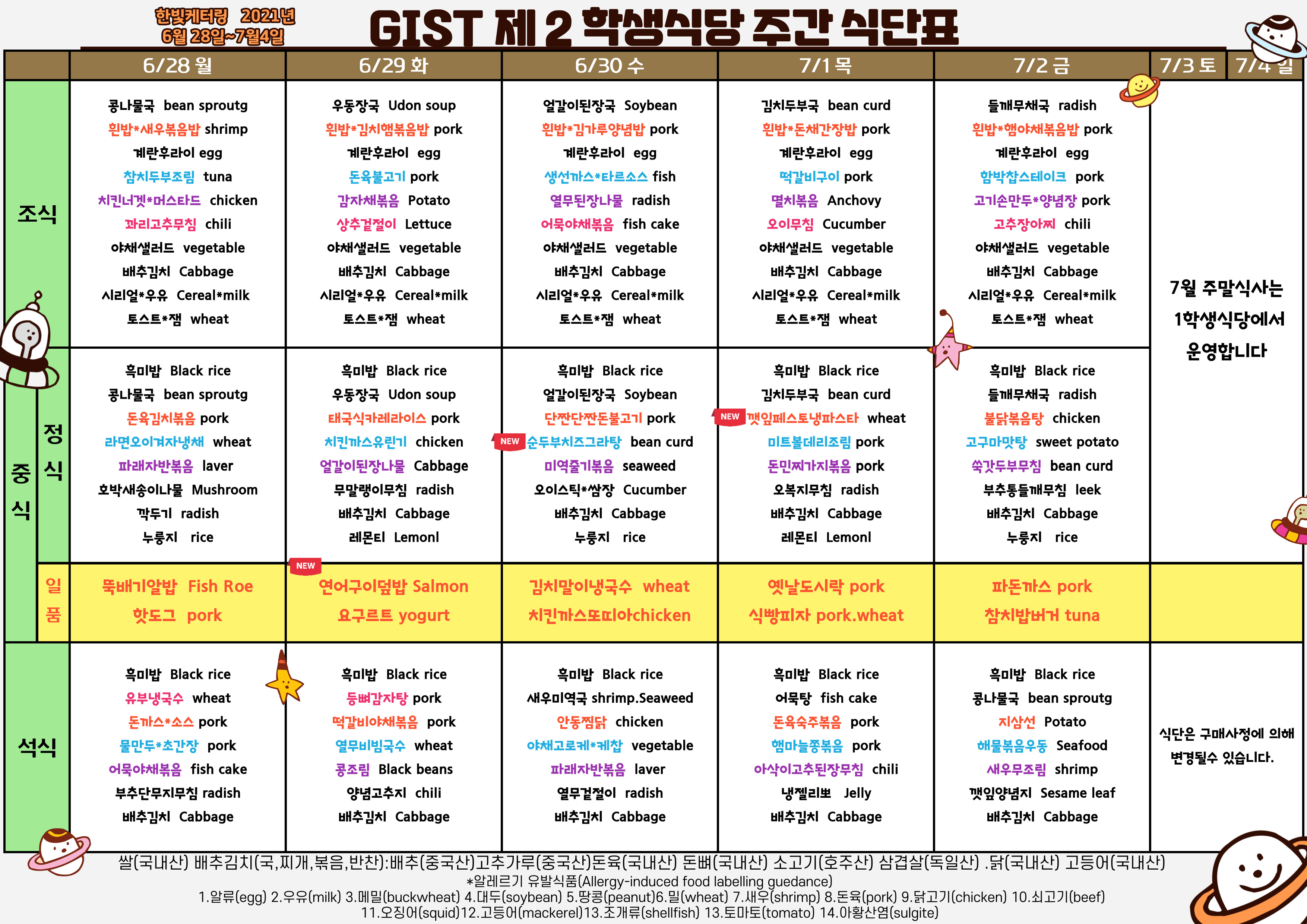 제2학생식당주간식단표(2021.06.28~2021.07.04)