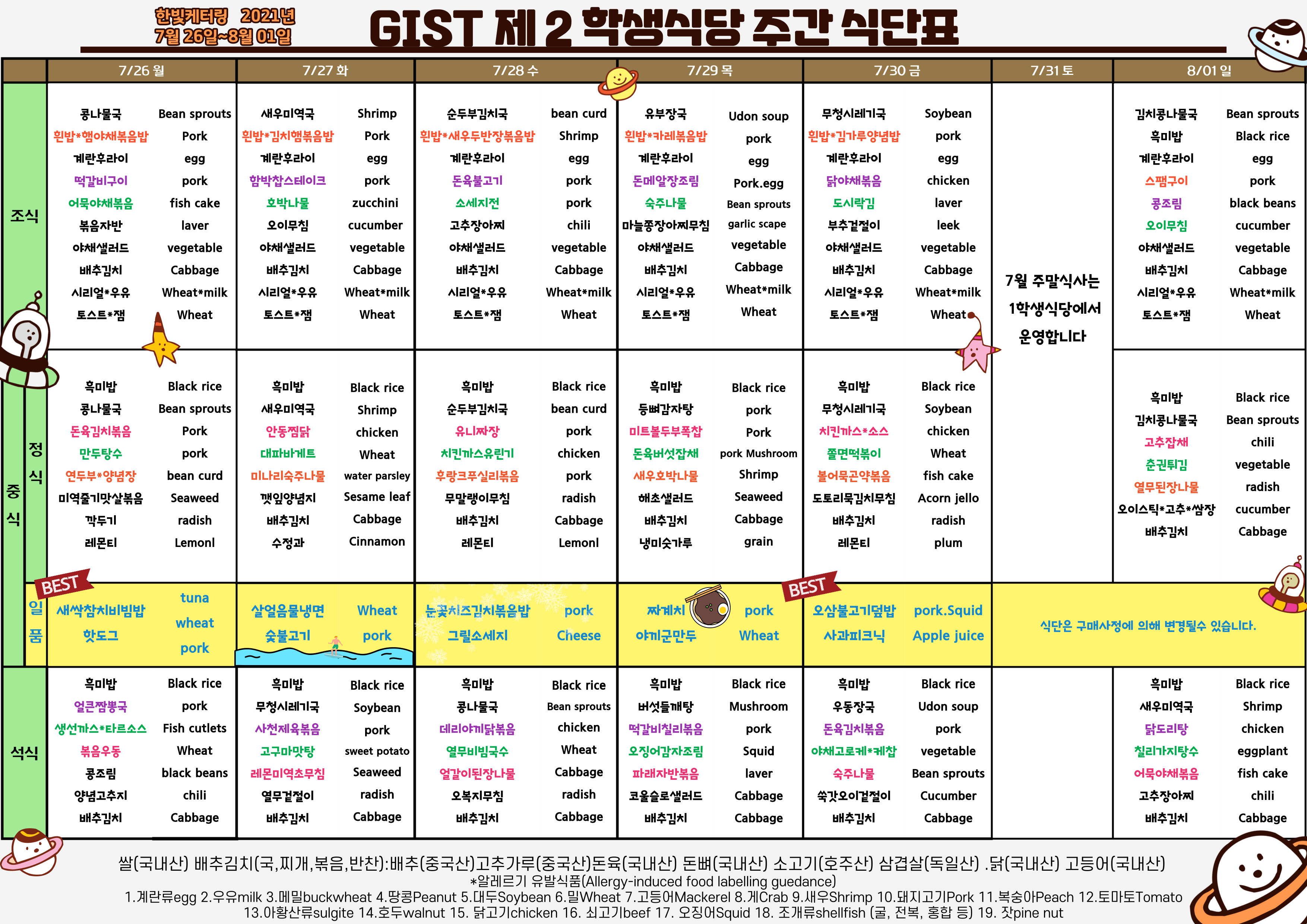 제2학생식당주간식단표(2021.07.26~08.01)