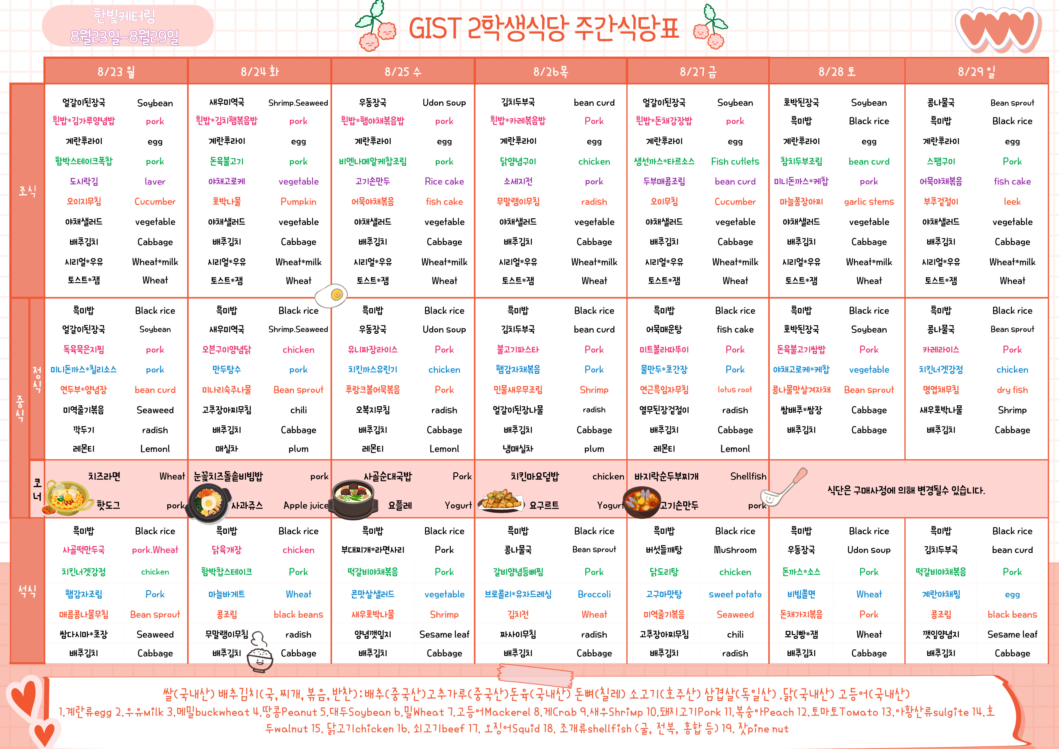 제2학생식당 주간식단표(2021.08.23~2021.08.29)
