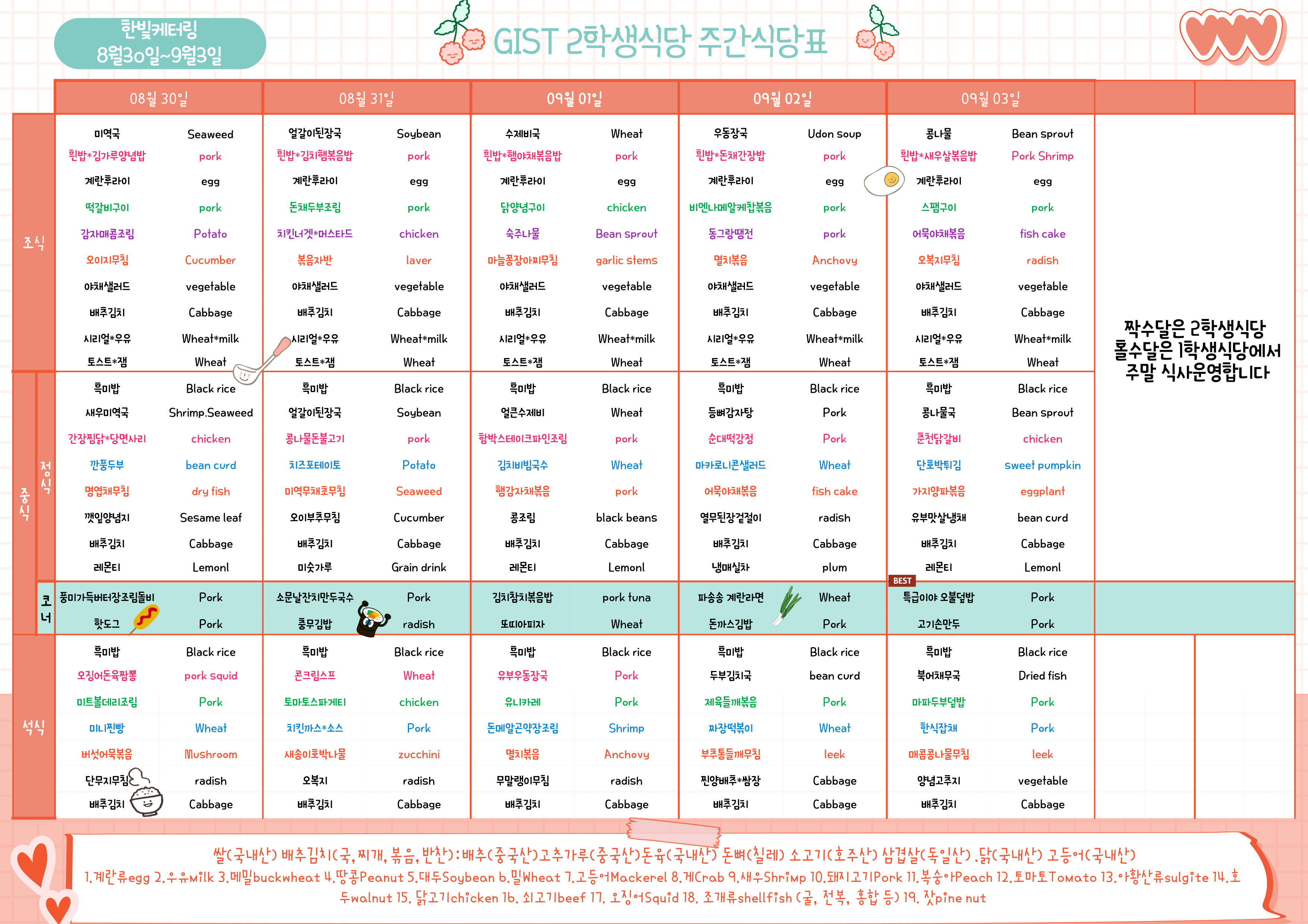 제2학생식당주간식단표(2021.08.27~2021.09.03)