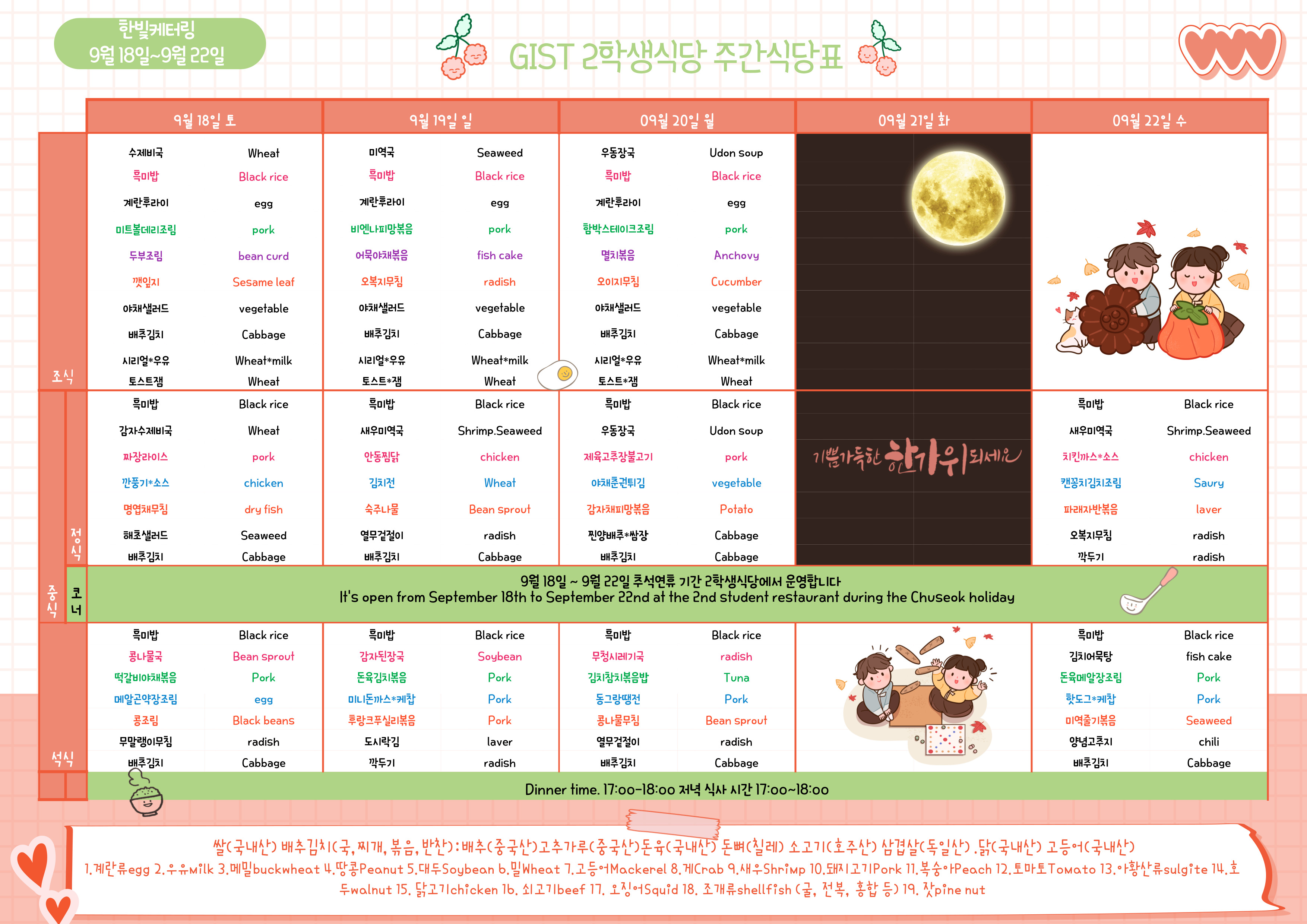 제2학생식당주간식단표(*주말~추석연휴기간2021.09.18~2021.09.22*)