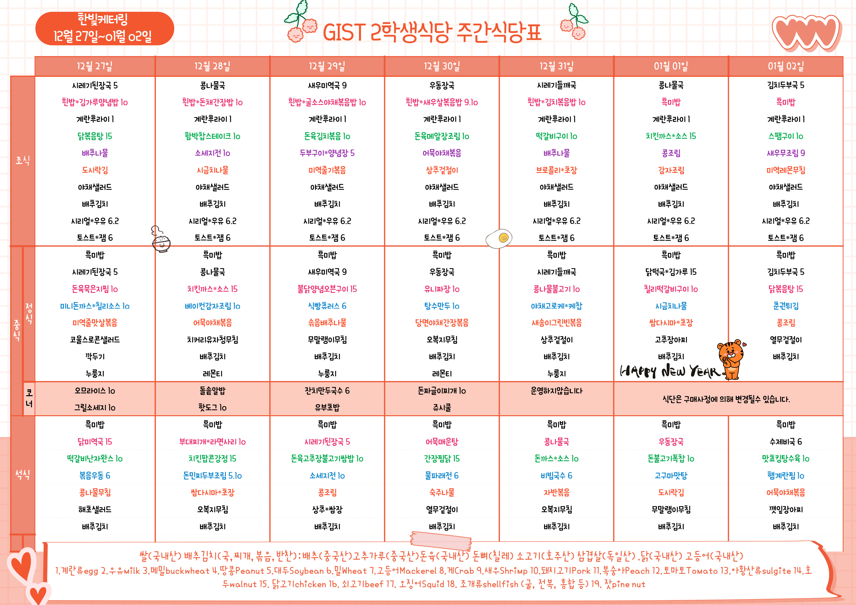 제2학생식당주간식단표(2021.12.27~2021.01.02)