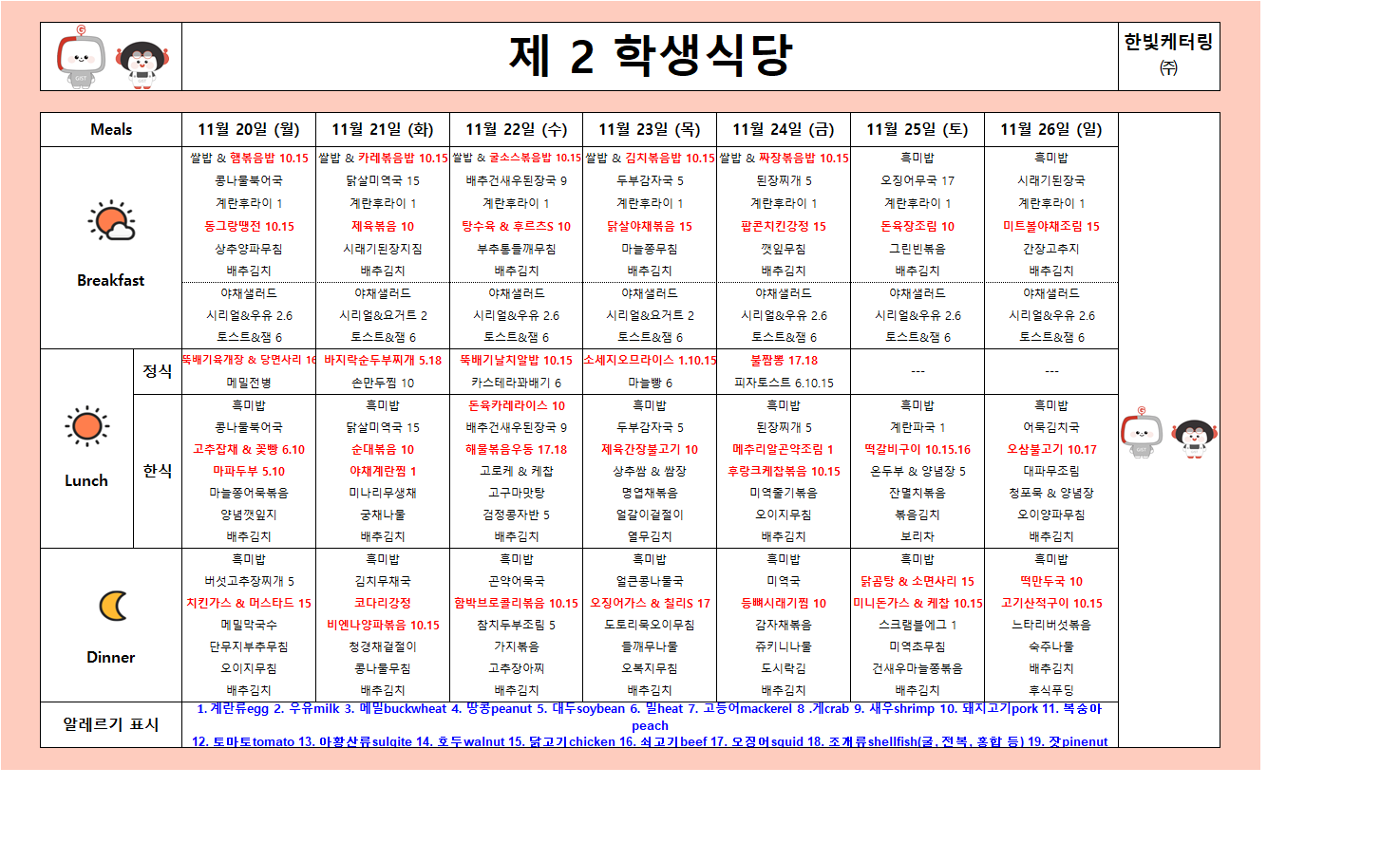 제2학생식당주간식단표(2023.11.20~23.11.26)