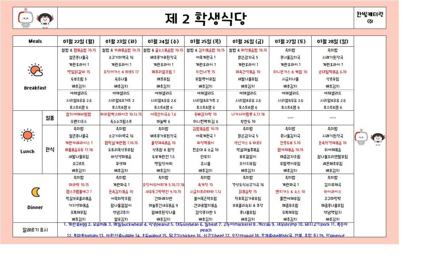 제2학생식당주간식단표(2024.01.22~2024.01.28)