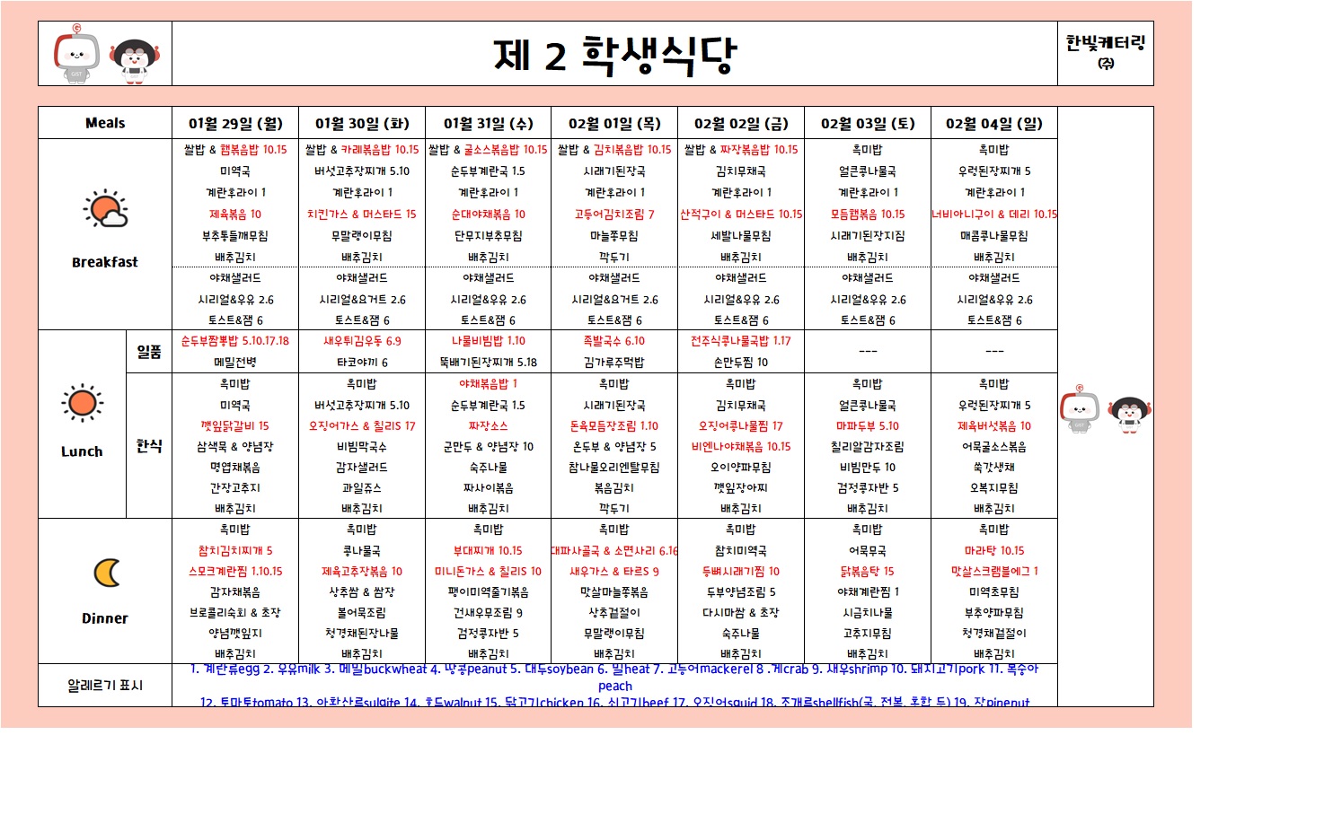 제2학생식당주간식단표(2024.01.29~2024.02.04)