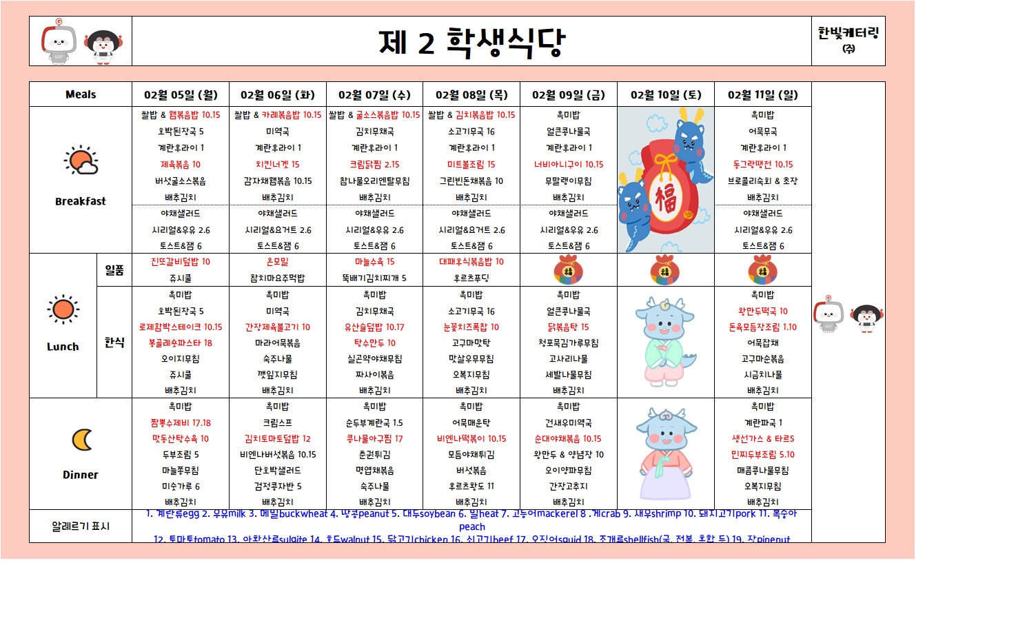 제2학생식당주간식단표(2024.02.05~2024.02.11)