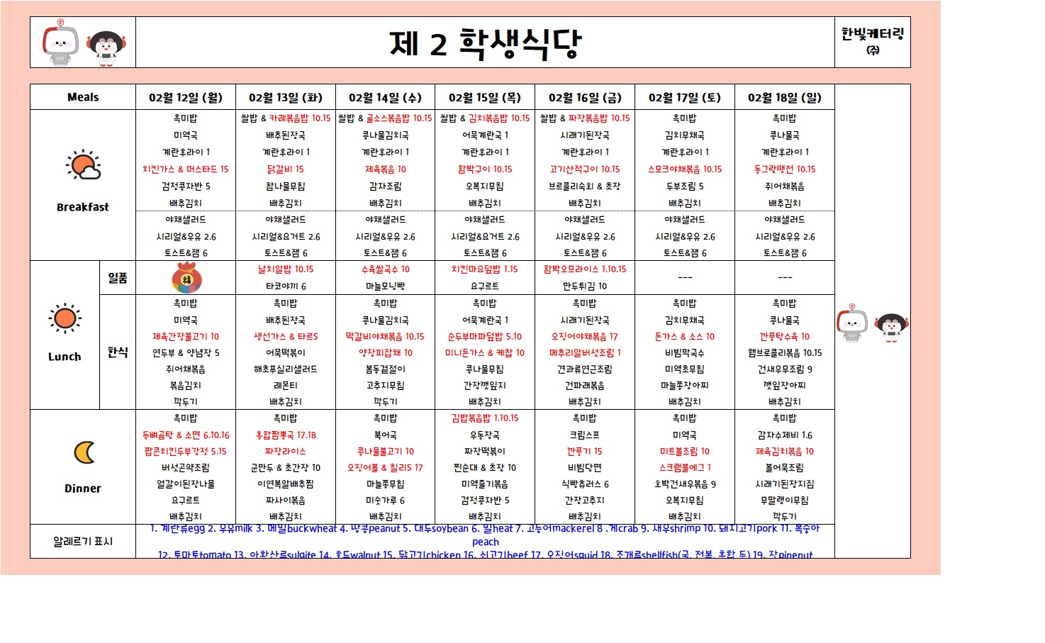 제2학생식당주간식단표(2024.02.12~2024.02.18)