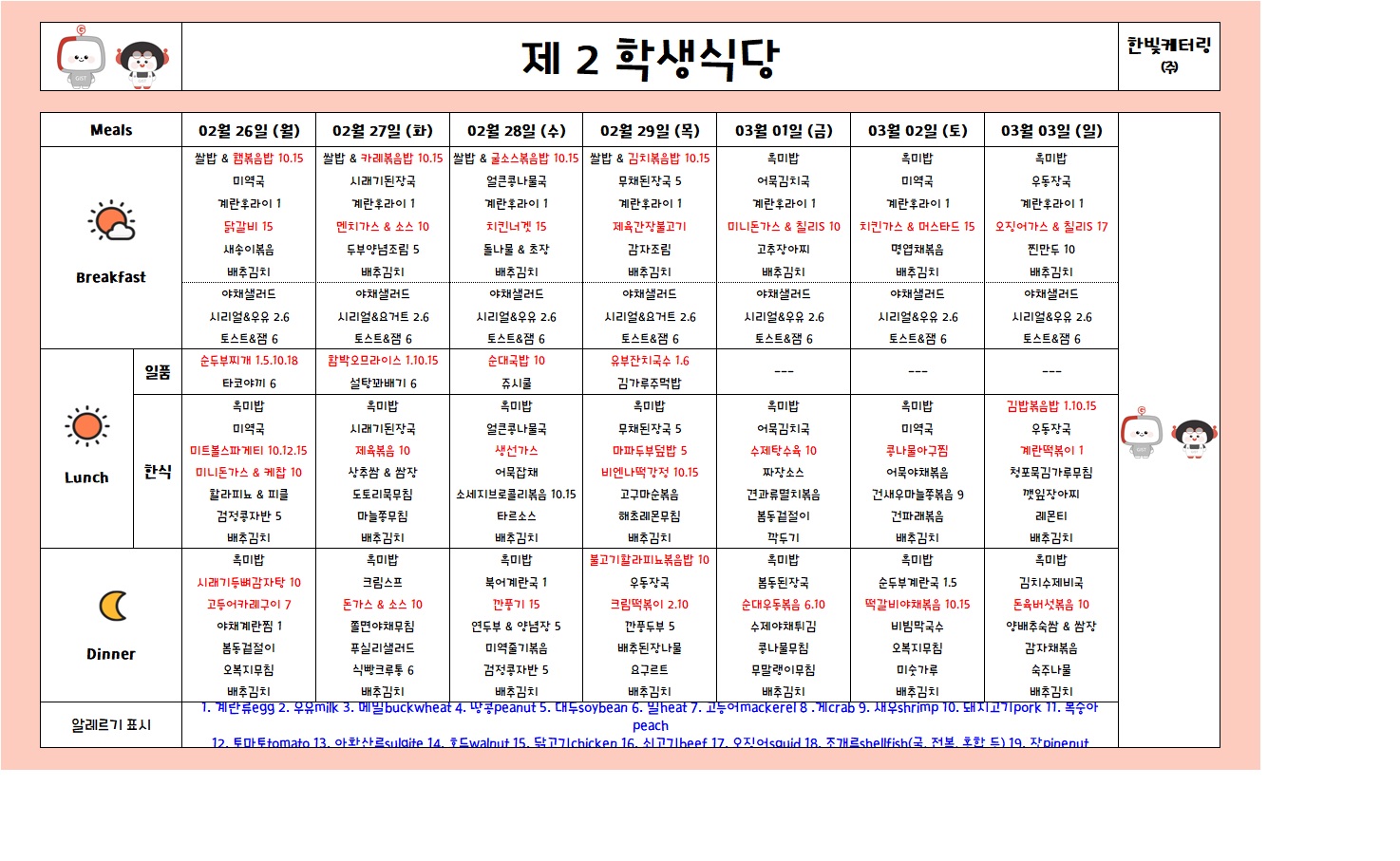 제2학생식당주간식단표(2024.02.26~2024.03.03)
