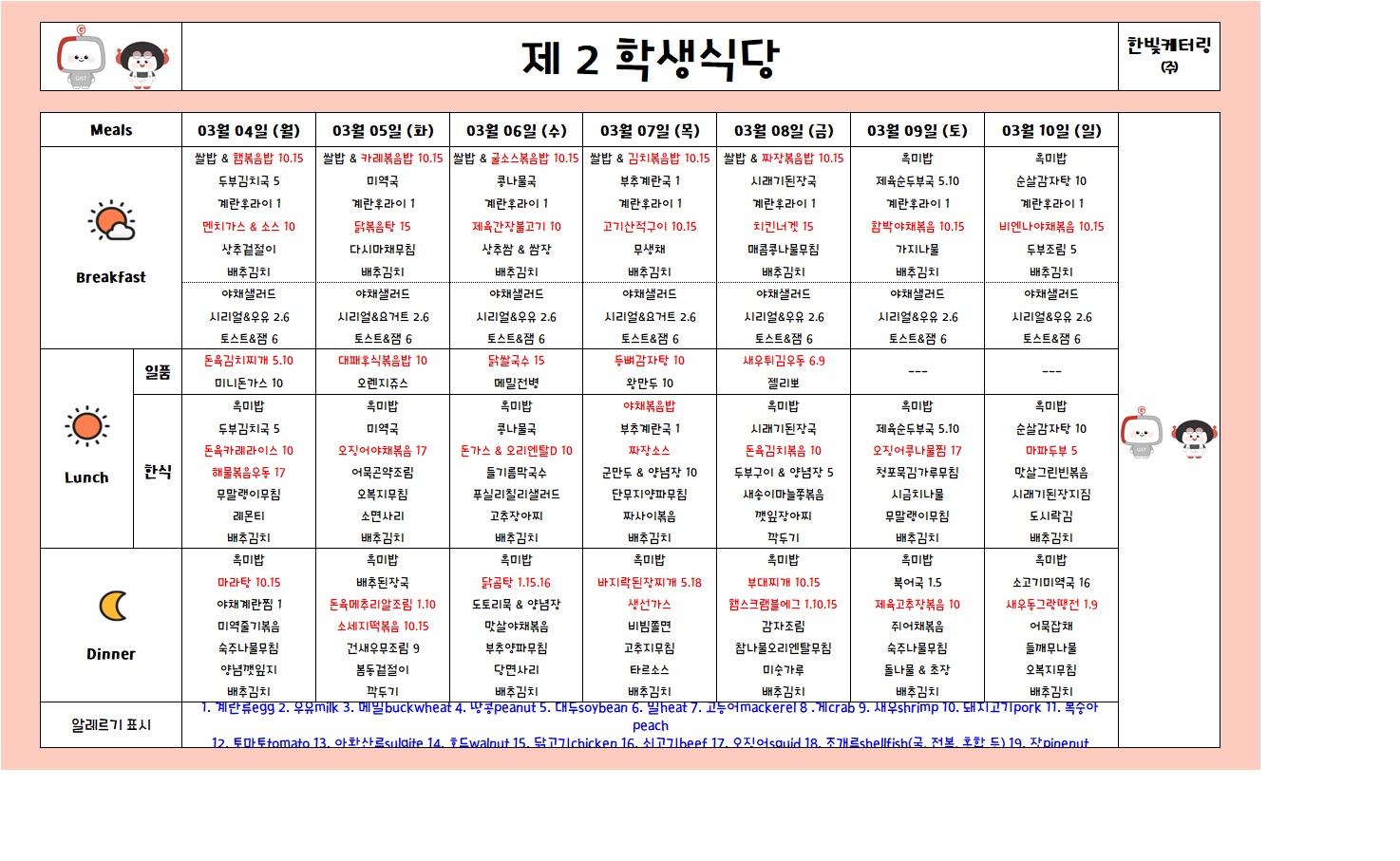 제2학생식당주간식단표(2024.03.04~2024.03.10)