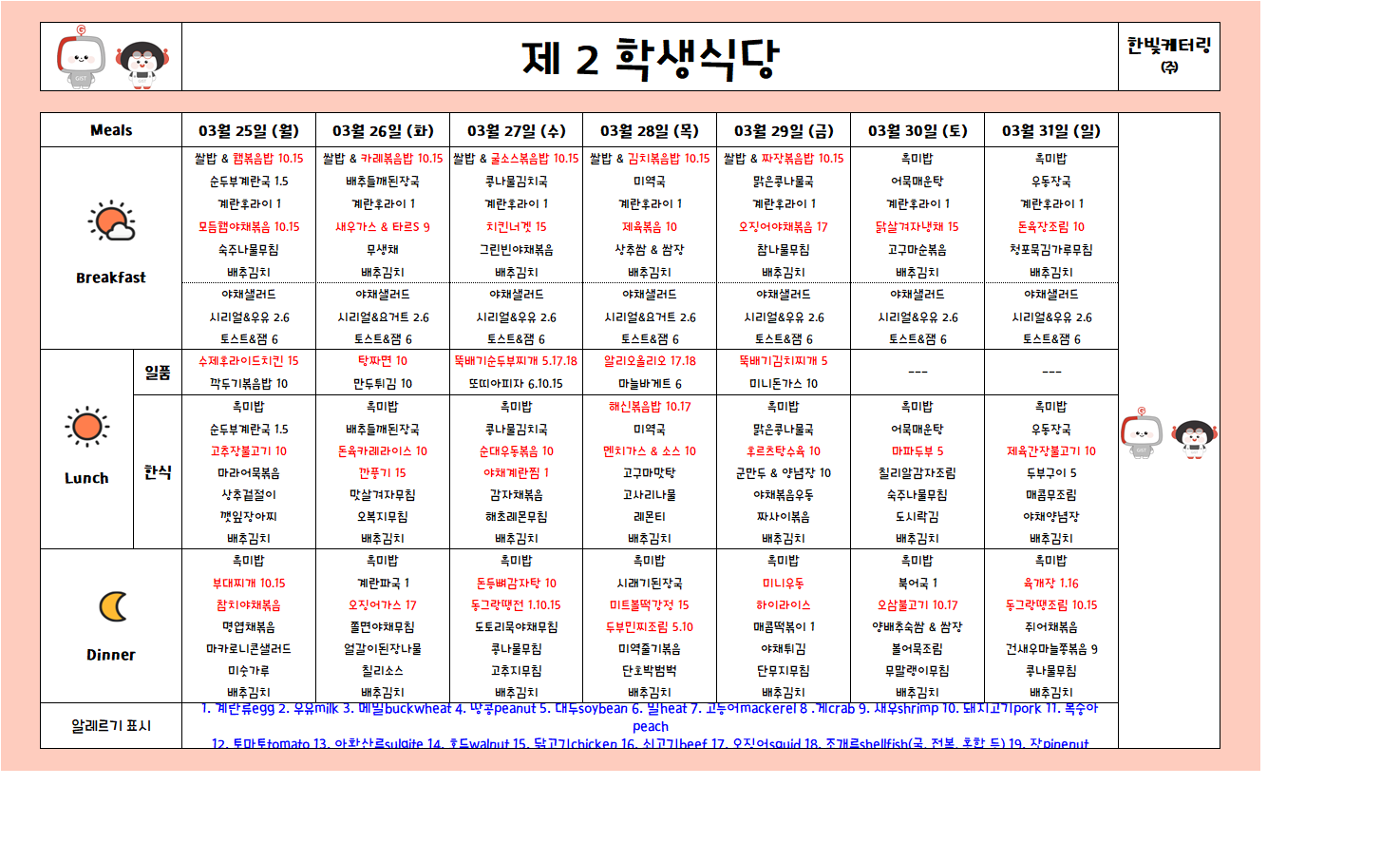 제2학생식당주간식단표(2024.03.25~2024.03.31)