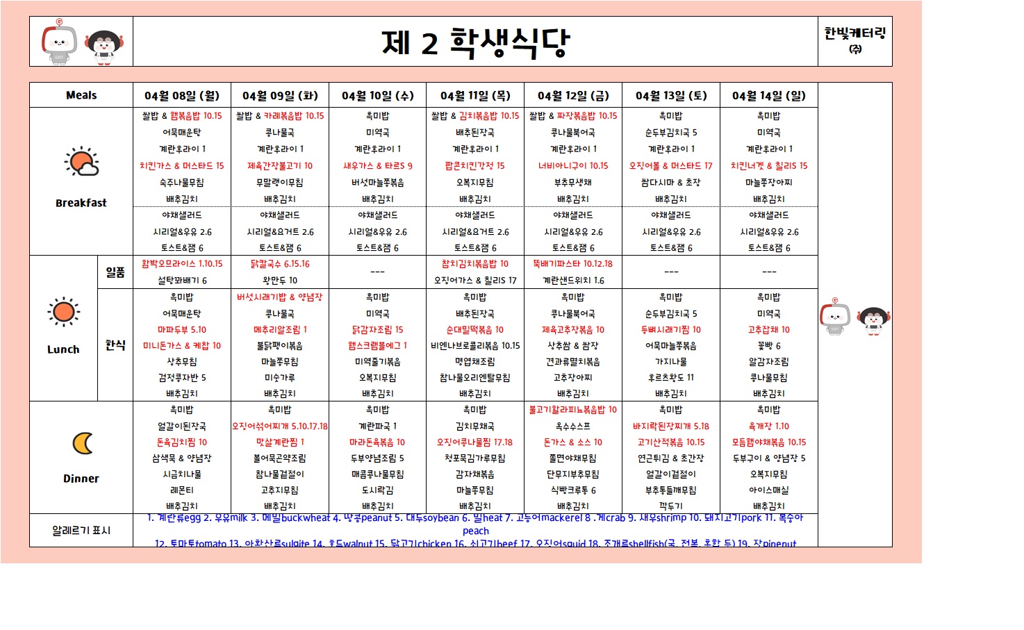 제2학생식당주간식단표(2024.04.08~2024.04.14)