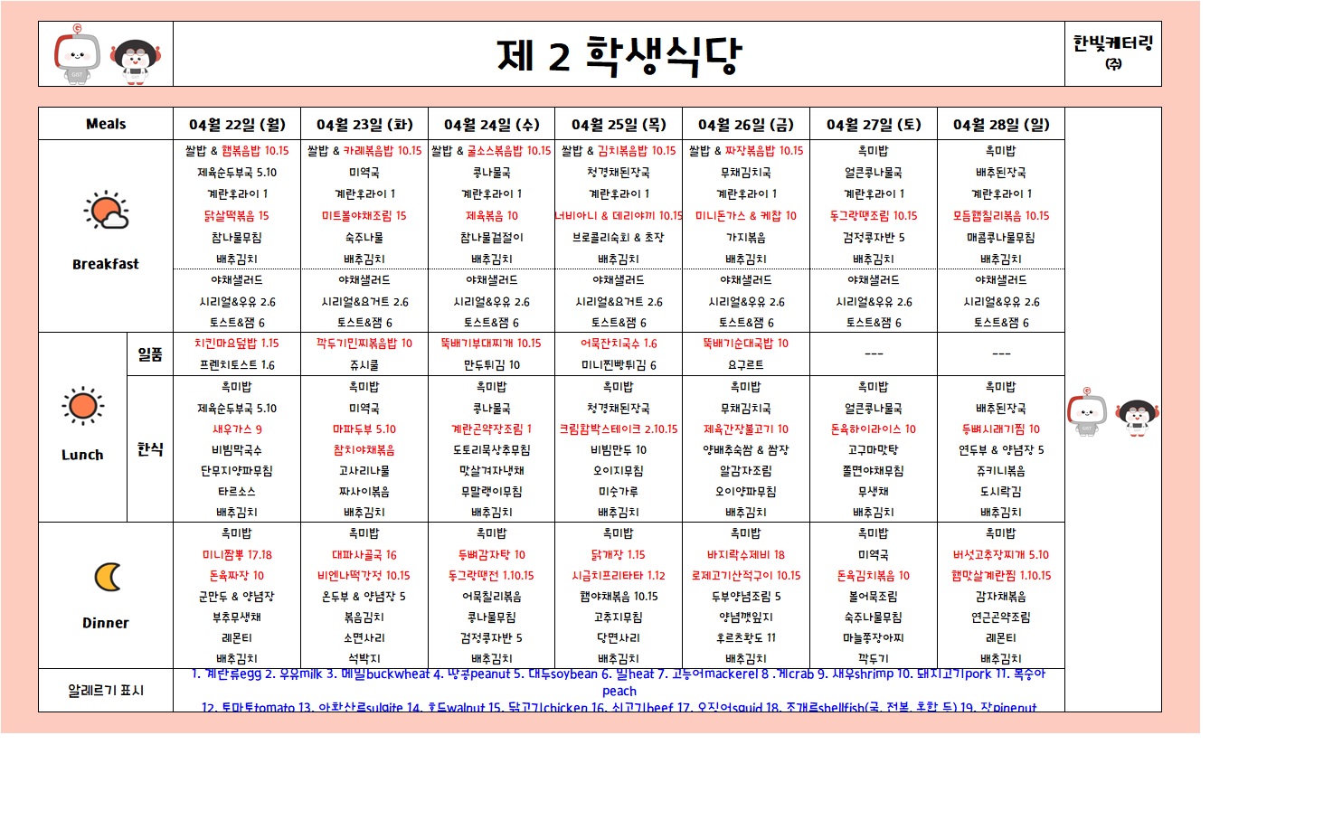 제2학생식당주간식단표(2024.04.22~2024.04.28)