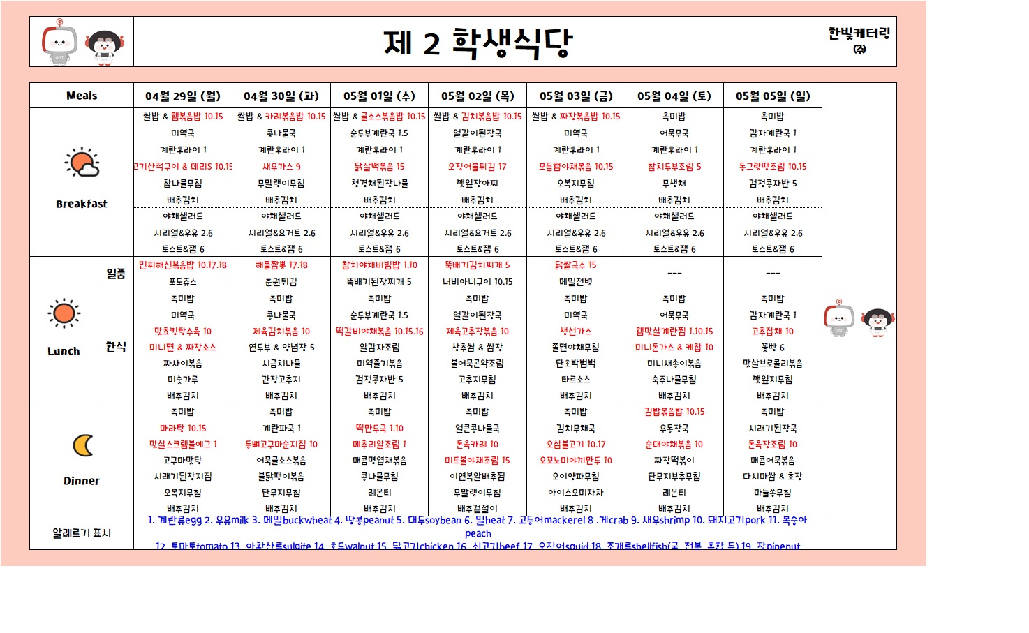 제2학생식당주간식단표(2024.04.29~2024.05.05)