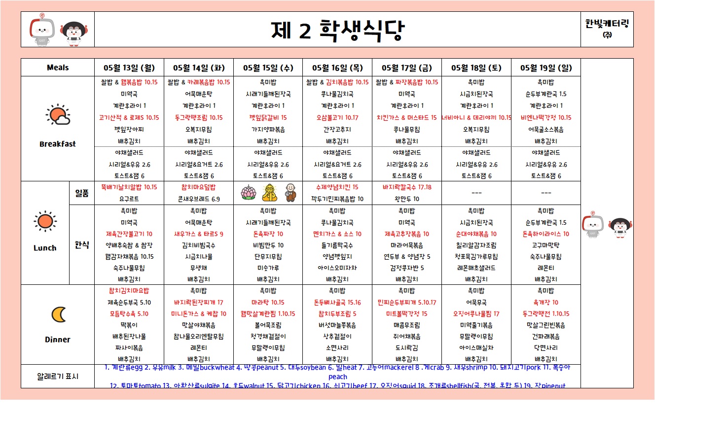 제2학생식당주간식단표(2024.05.13~2024.05.19)