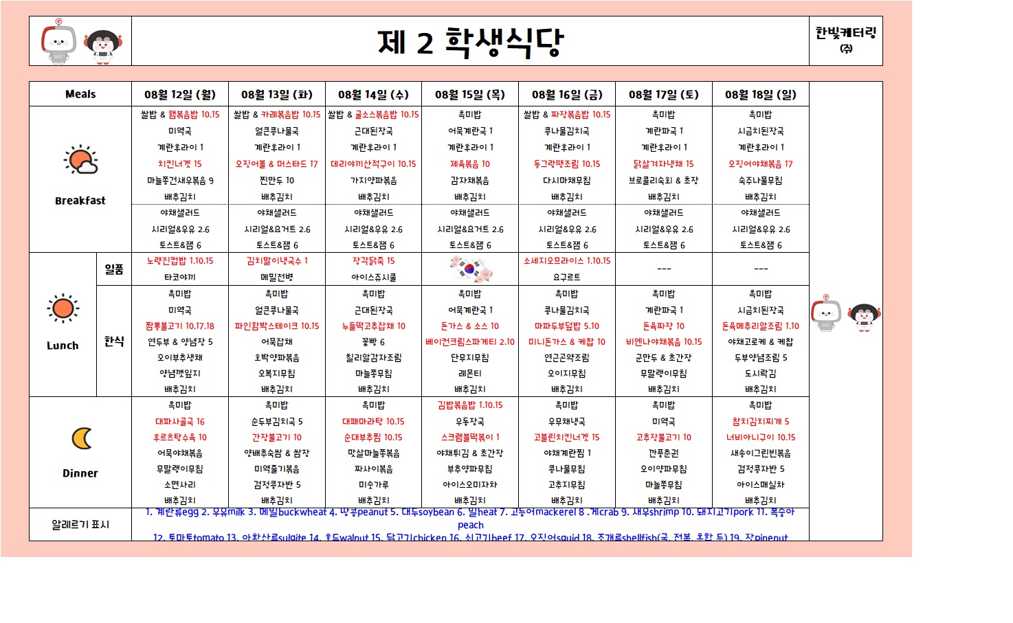 제2학생식당주간식단표(2024.08.12~2024.08.18)