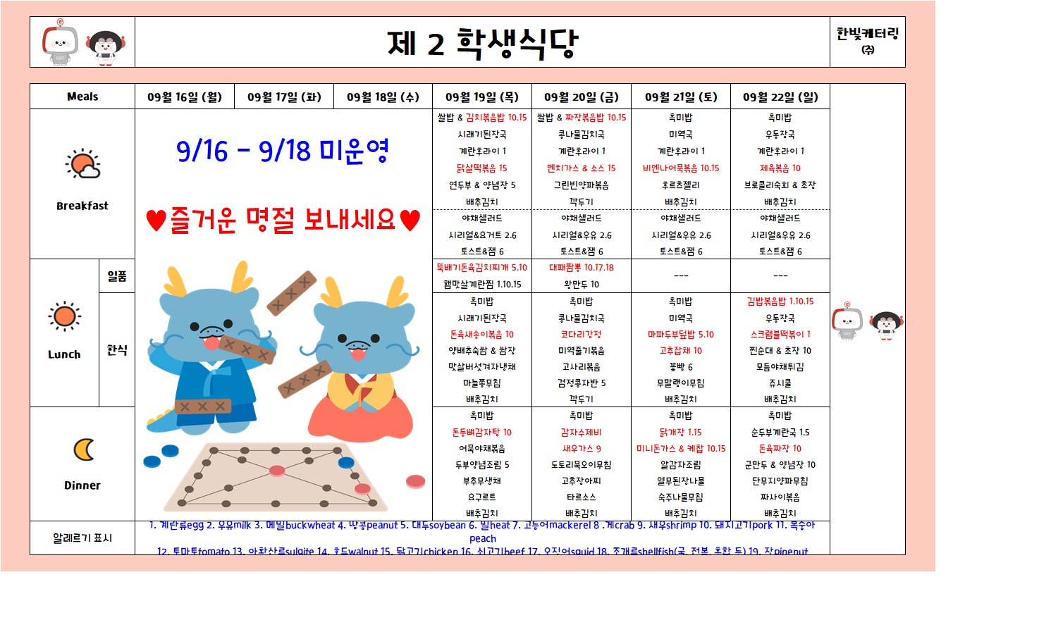 제2학생식당주간식단표(2024.09.16~2024.09.22)