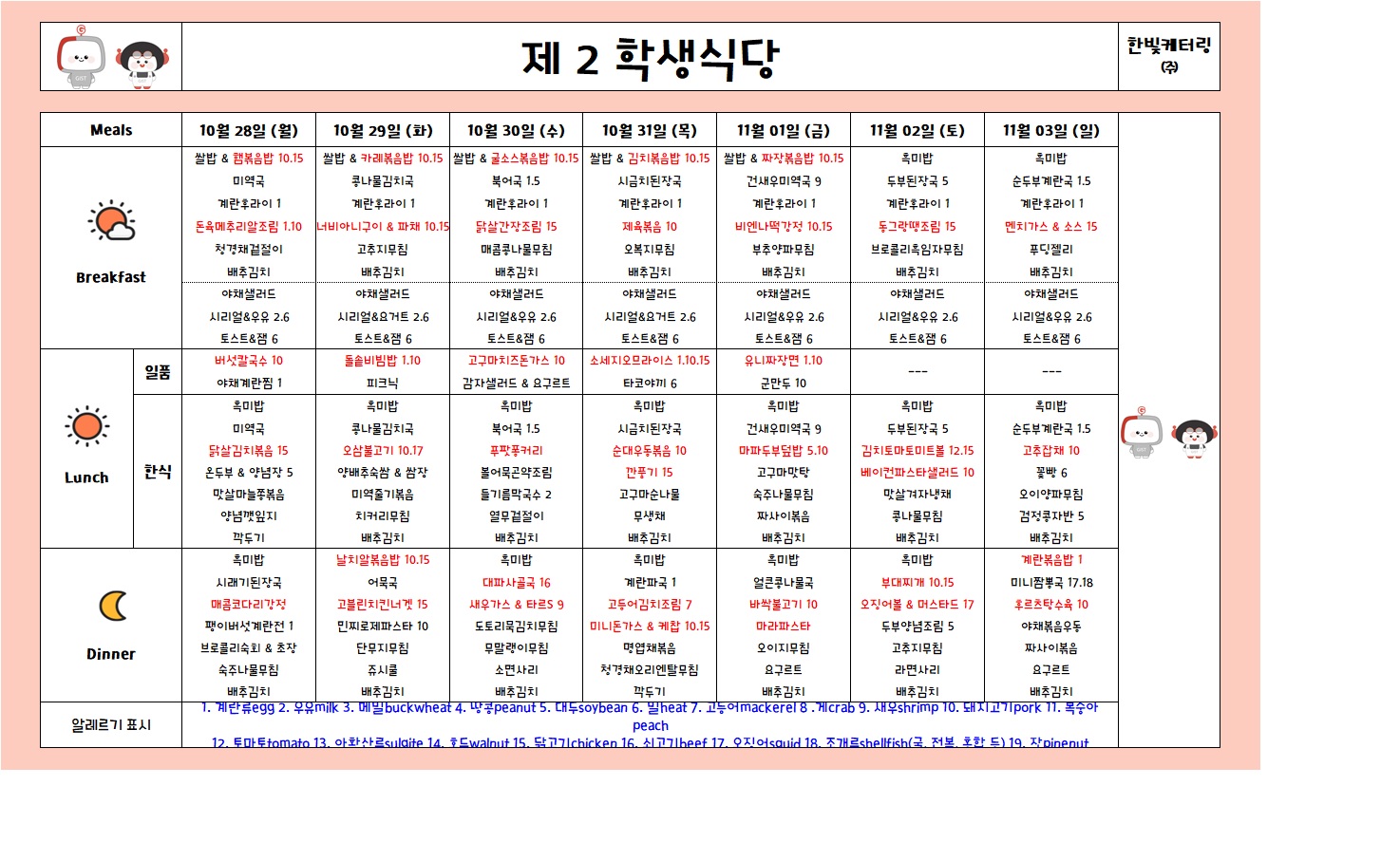 제2학생식당주간식단표(2024.10.28~2024.11.03)