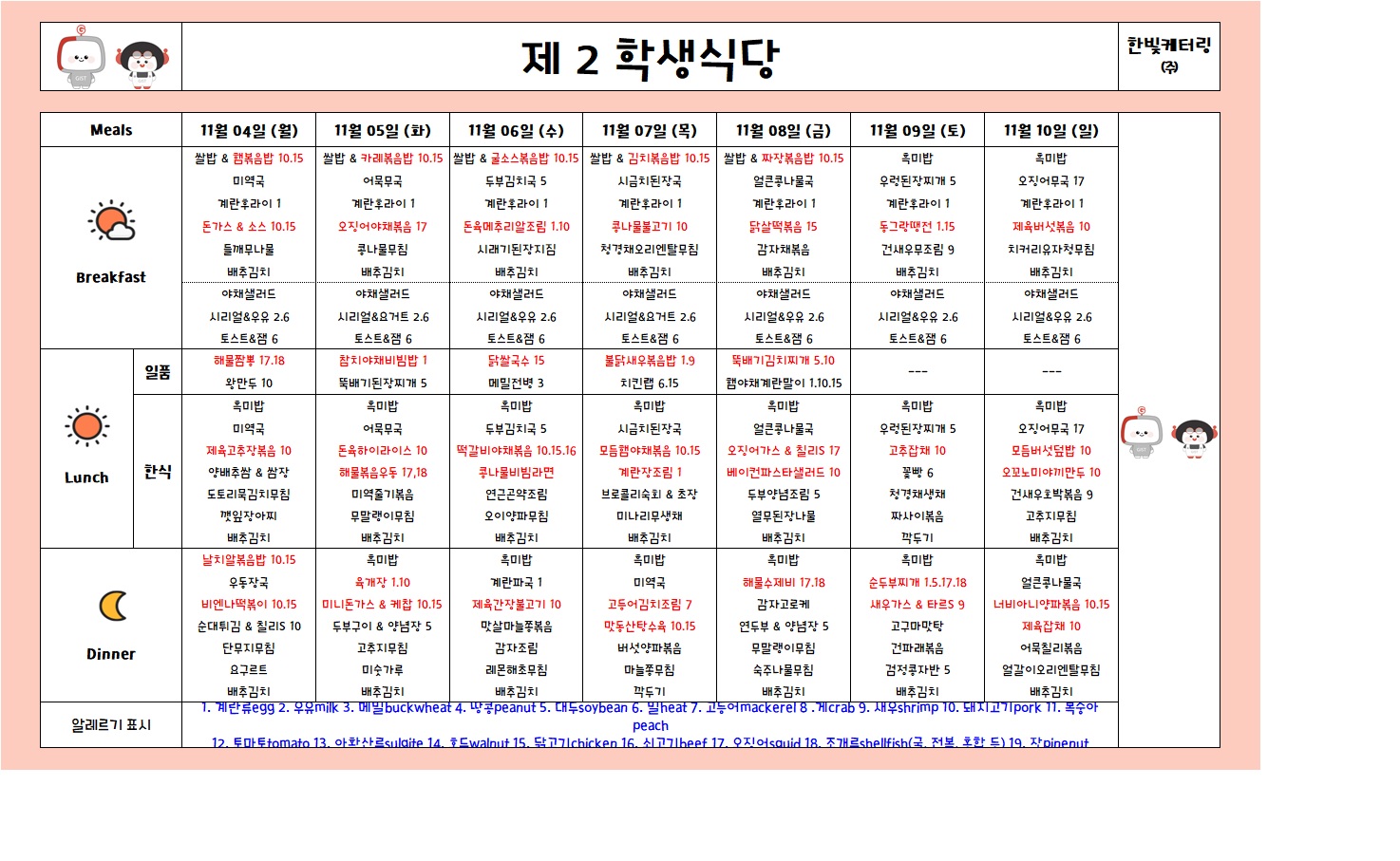 제2학생식당주간식단표(2024.11.04~2024.11.10)