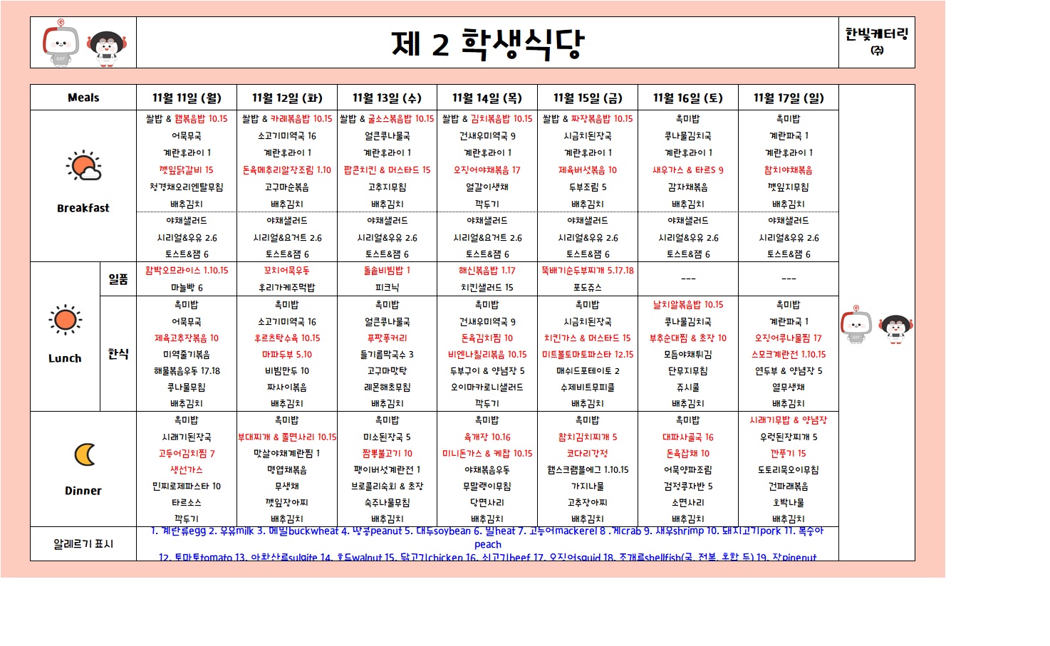 제2학생식당주간식단표(2024.11.11~2024.11.17)