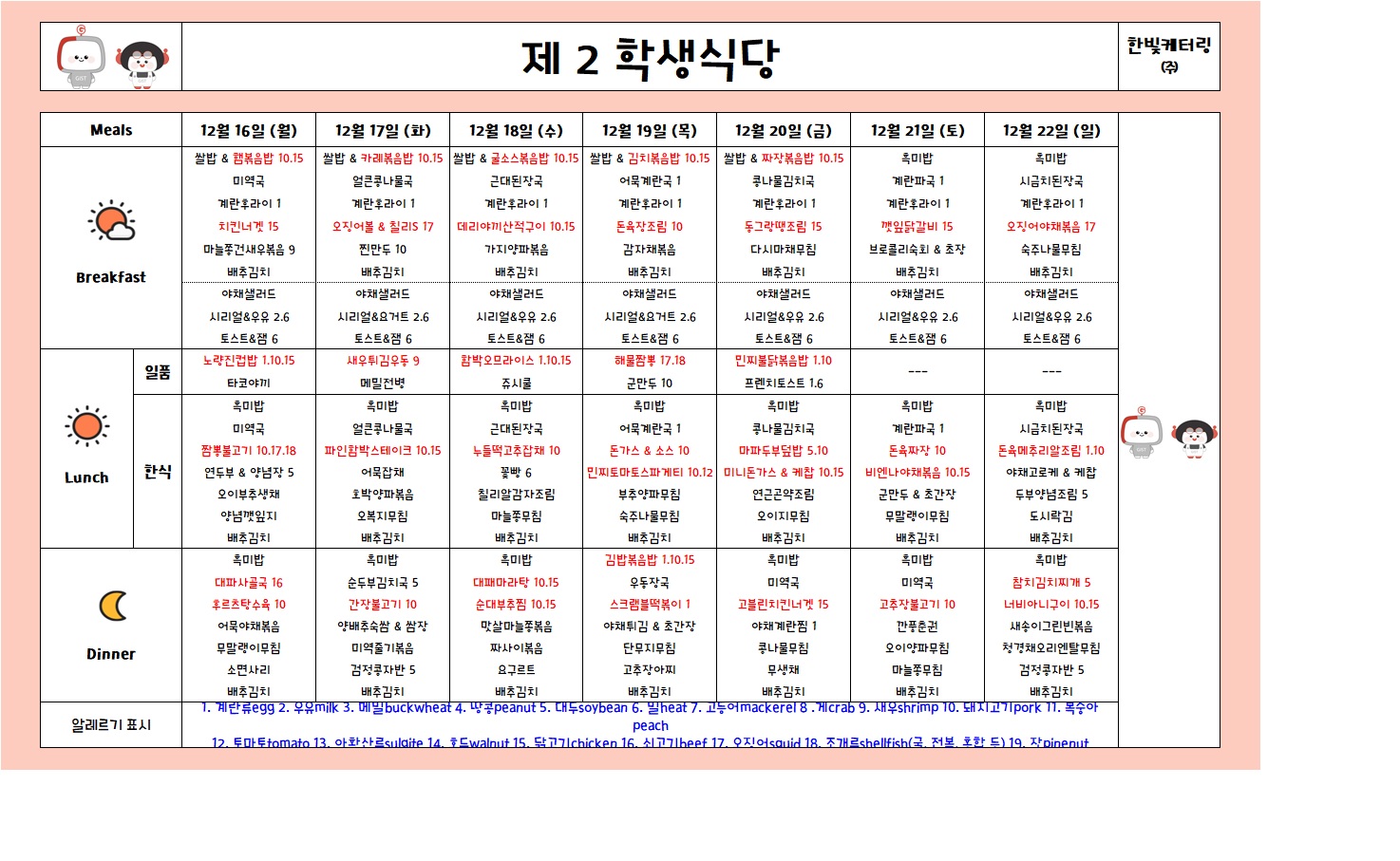 제2학생식당주간식단표(2024.12.16~2024.12.22)