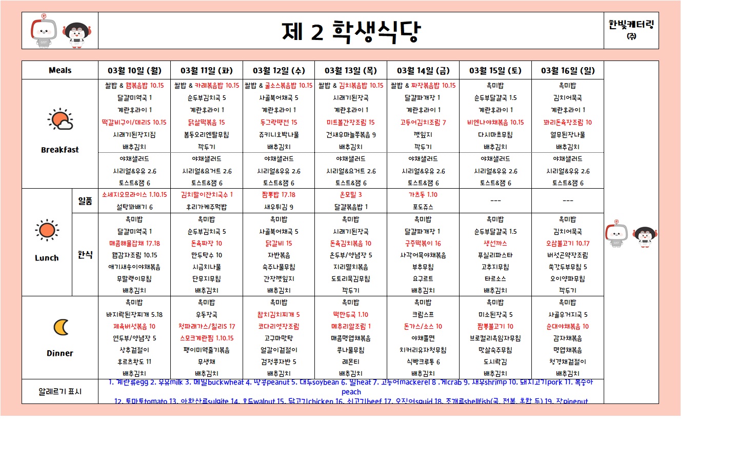 제2학생식당주간식단표(2025.03.10-2025.03.16)