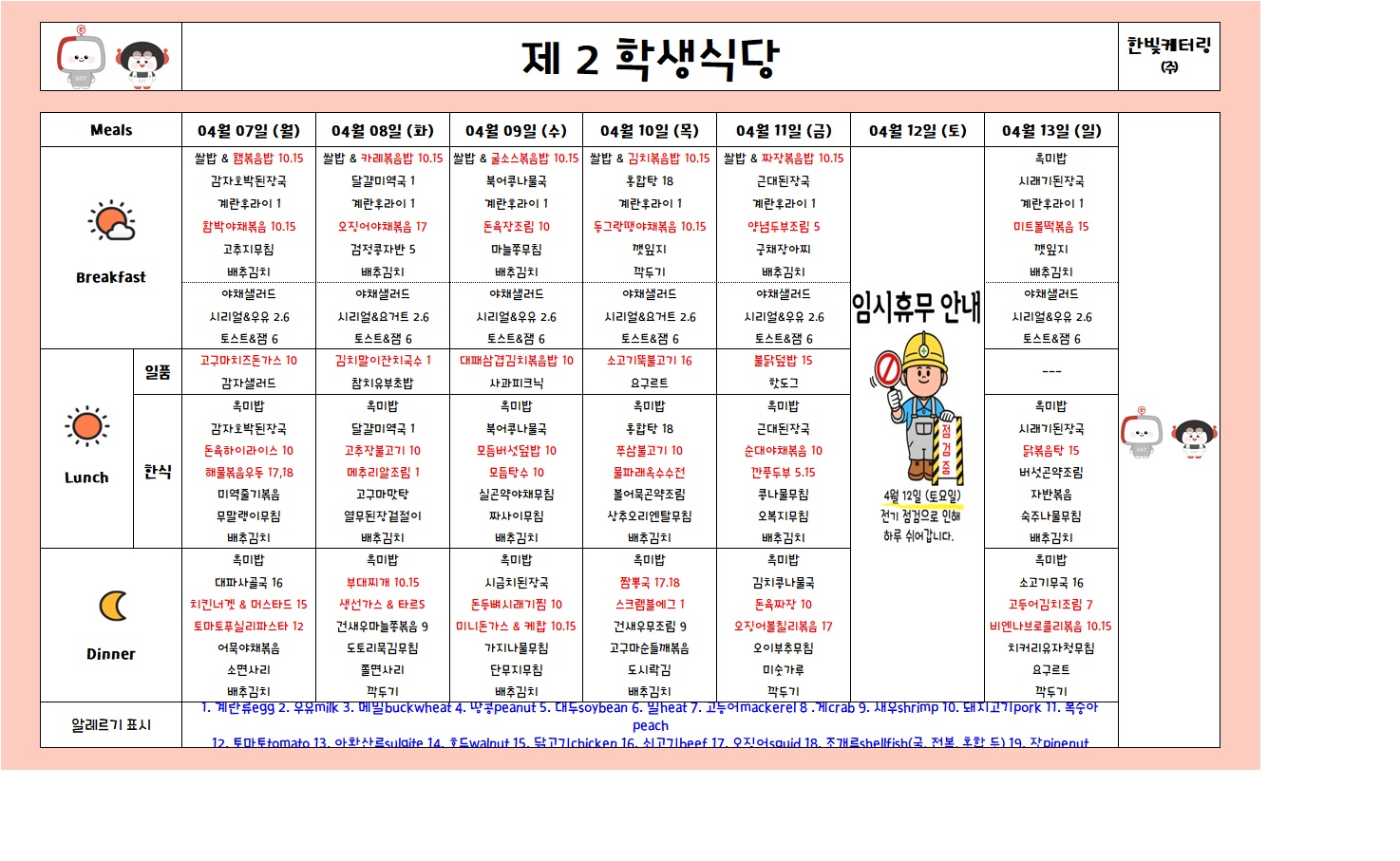 제2학생식당주간식단표(2025.04.07-2025.04.13)