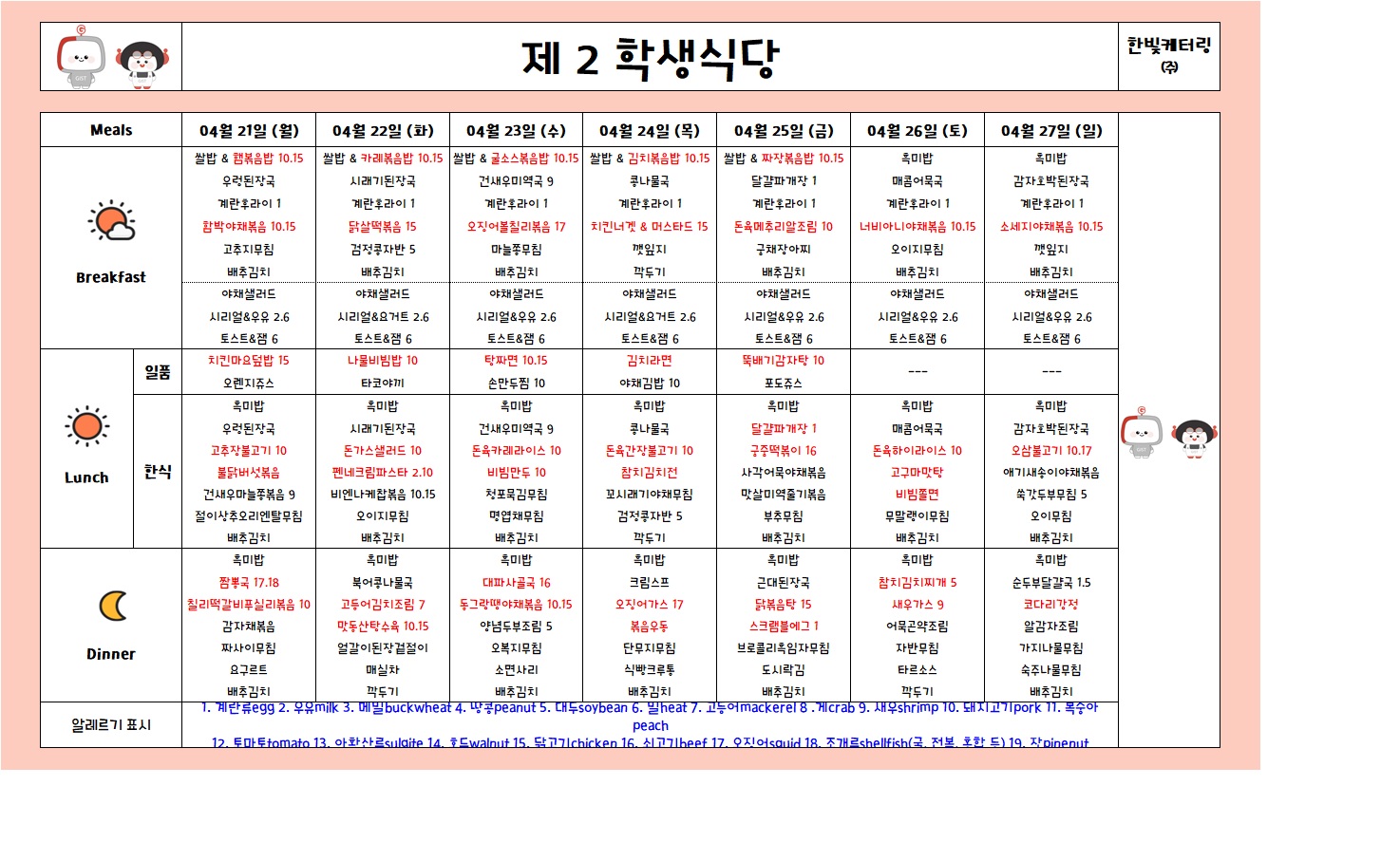 제2학생식당주간식단표(2025.04.21-2025.04.27)