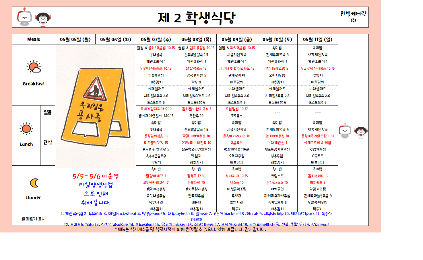 제2학생식당주간식단표(2025.05.05-2025.05.11)
