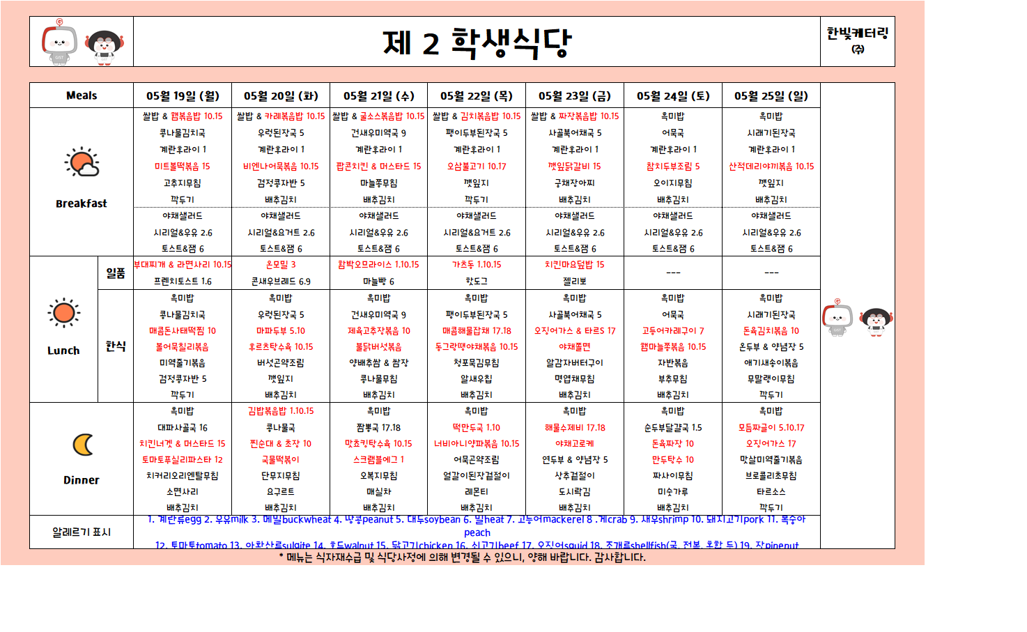 제2학생식당주간식단표(2025.05.19-2025.05.25)