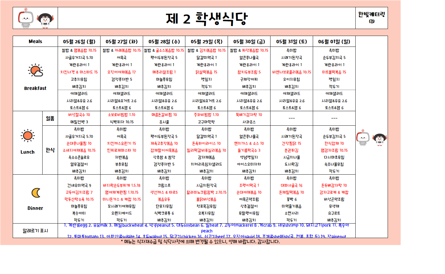 제2학생식당주간식단표(2025.05.16-2025.06.01)