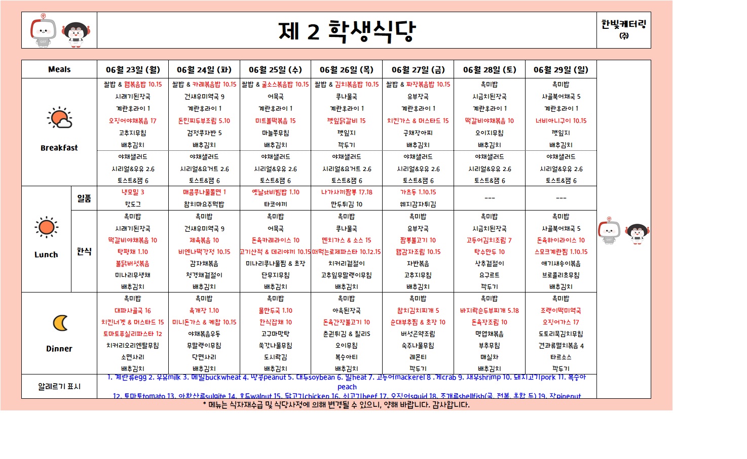 제2학생식당주간식단표(2025.06.23-2025.06.29)