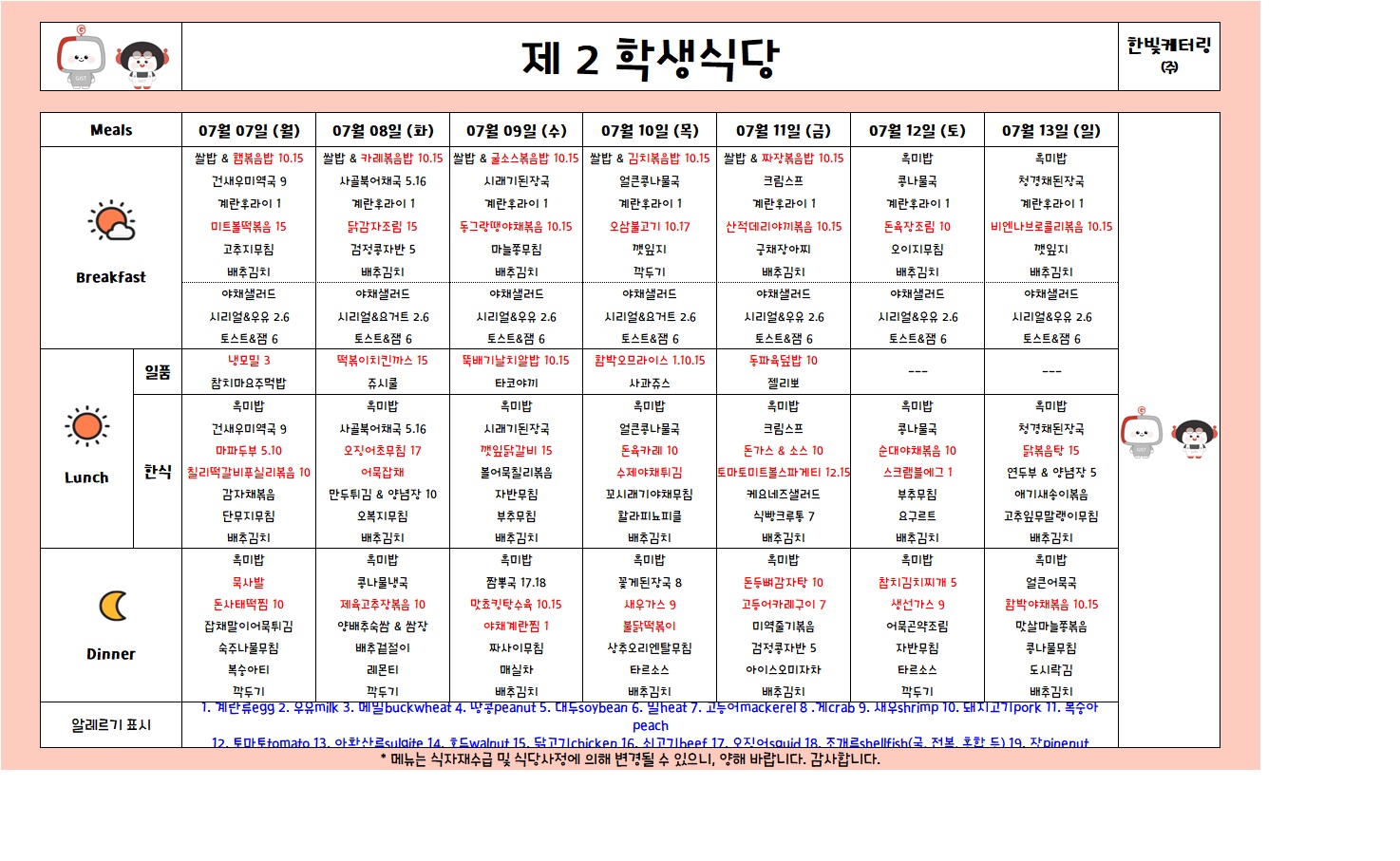 제2학생식당주간식단표(2025.07.07-2025.07.13)