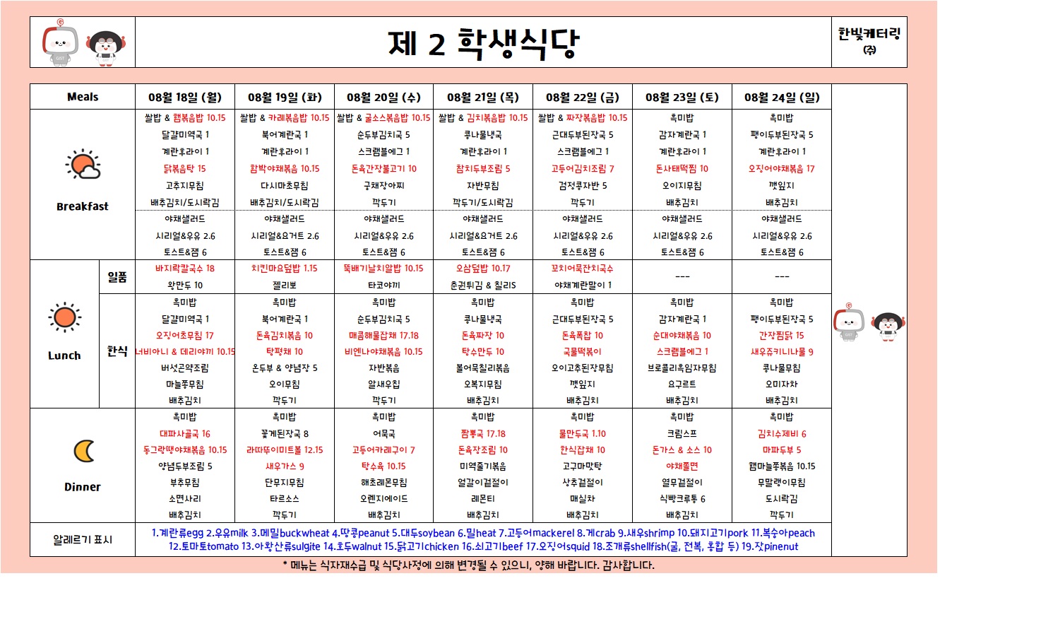 제2학생식당주간식단표(2025.08.18-2025.08.24)