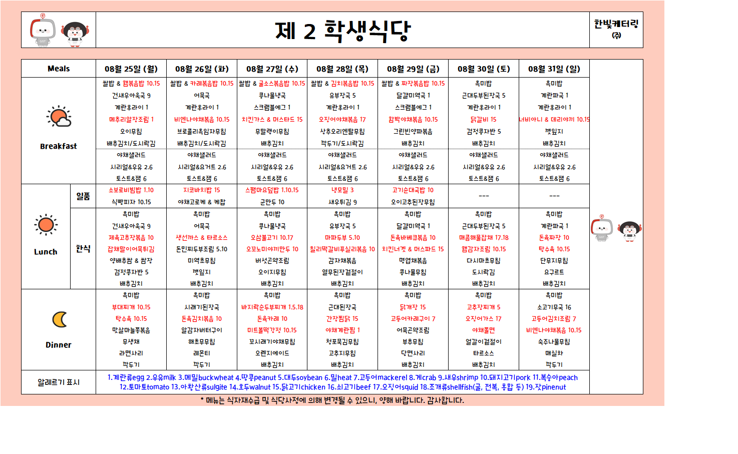 제2학생식당주간식단표(2025.08.25-2025.08.31)