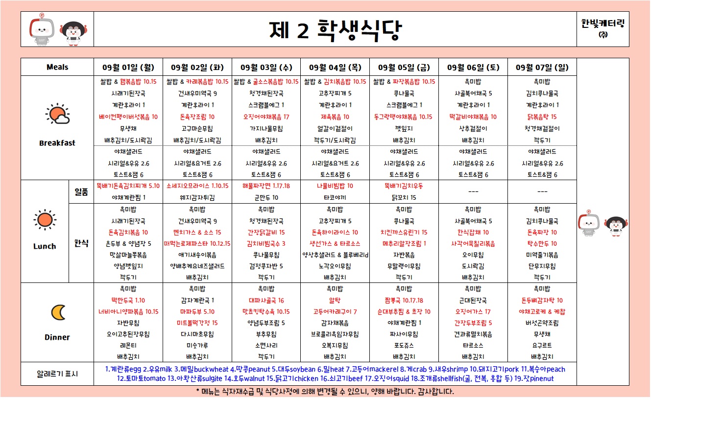 제2학생식당주간식단표(2025.09.01-2025.09.07)