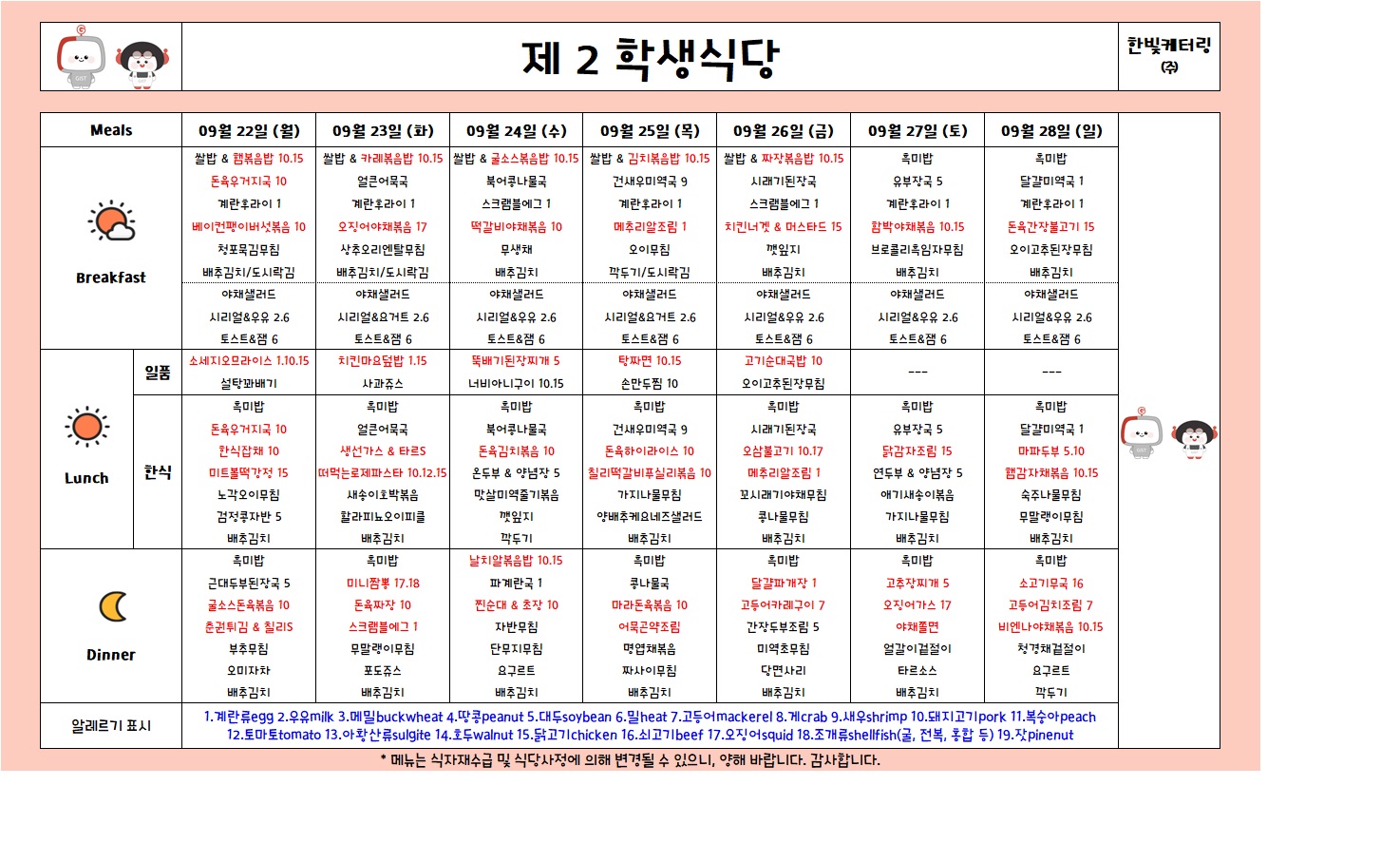 제2학생식당주간식단표(2025.09.22-2025.09.28)