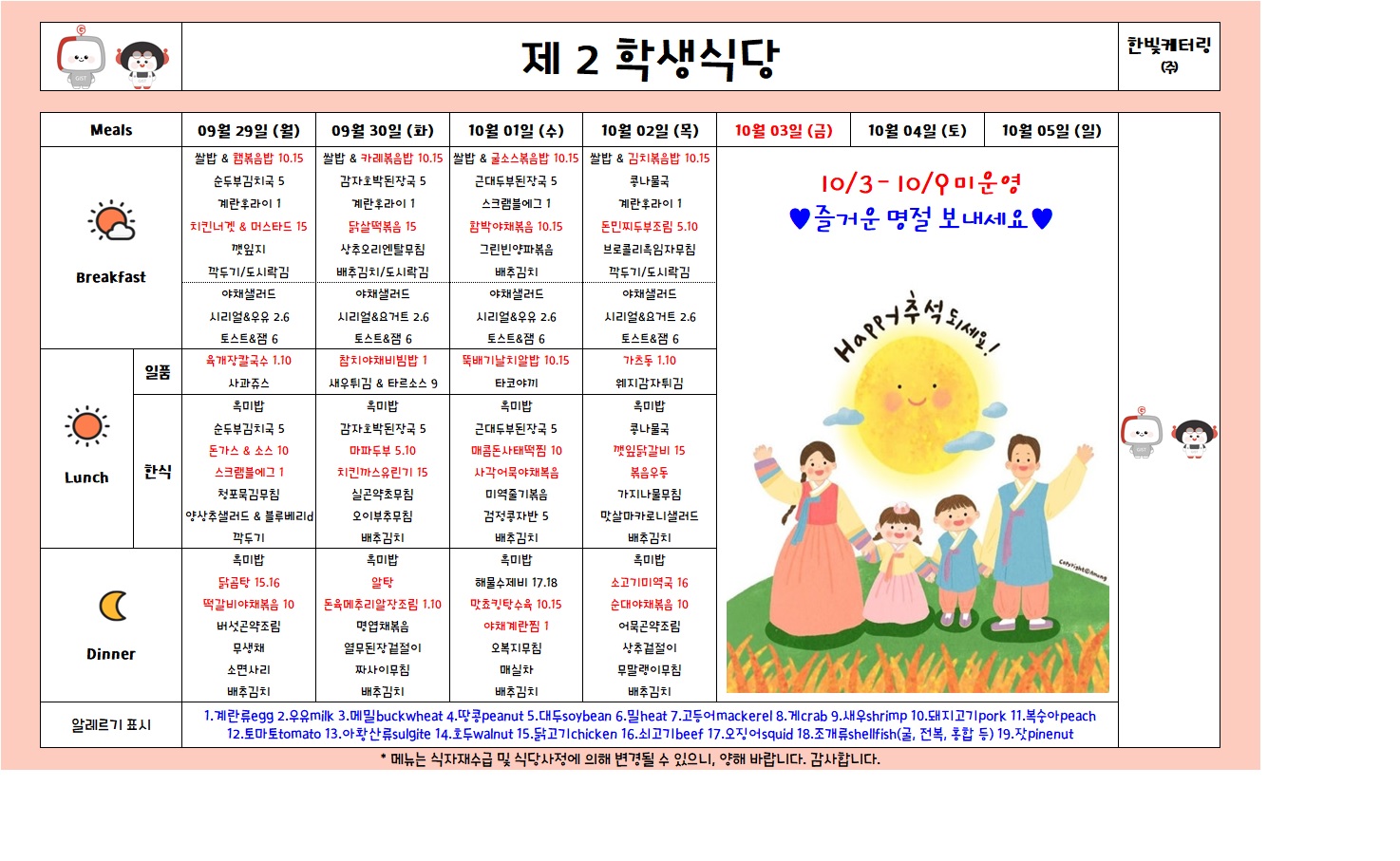 제2학생식당주간식단표(2025.09.29-2025.10.05)