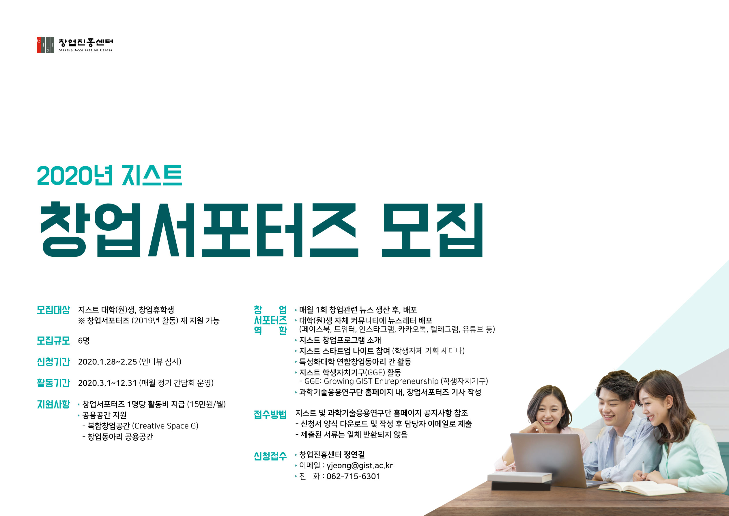 광주과학기술원 창업진흥센터는 지스트의 창업문화를 조성하고 창업프로그램의 원활한 홍보와 학생 간의 소통을 증진하기 위하여 2020년 창업서포터즈를 모집하고자 하오니 많은 관심과 참여를 부탁드립니다.