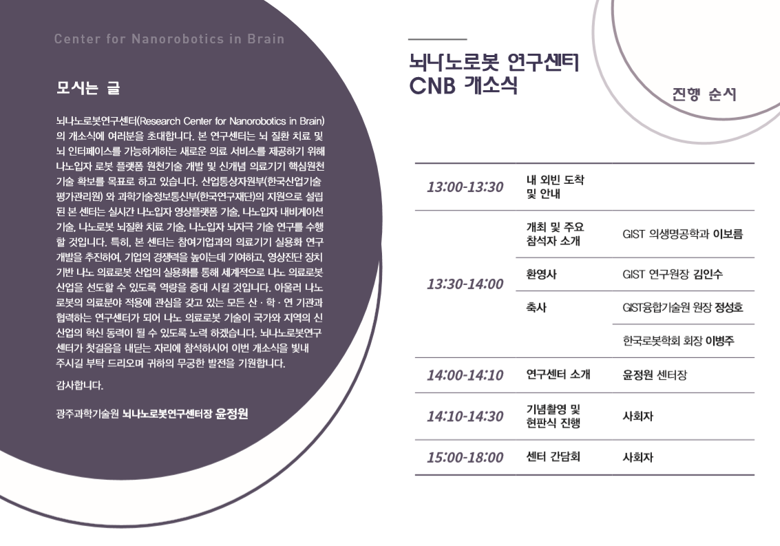 뇌 나노로봇 연구센터가 첫걸음을 내딛는 자리에 참석하시어 이번 개소식을 빛내 주시길 부탁드립니다.